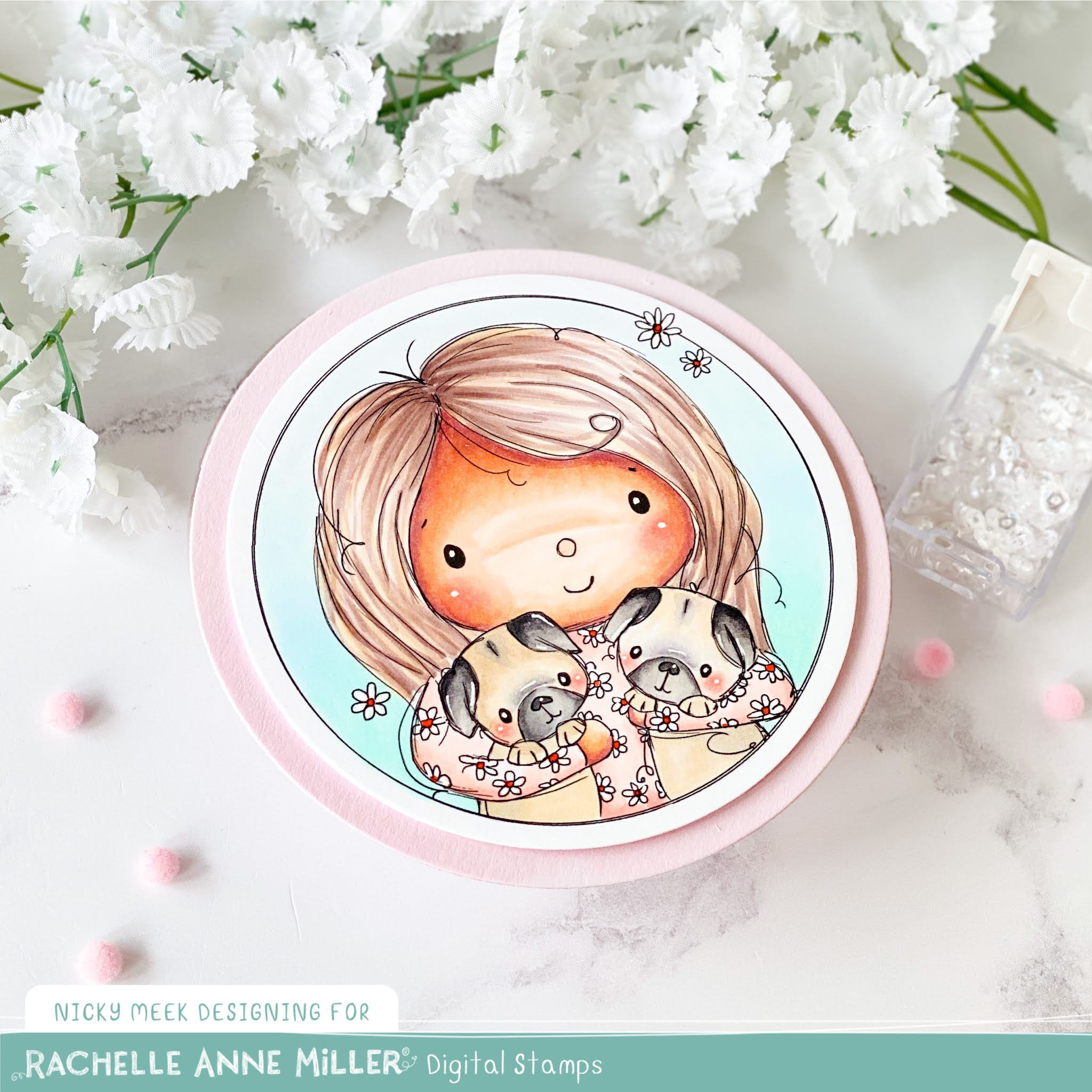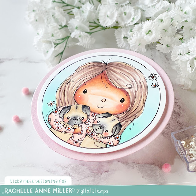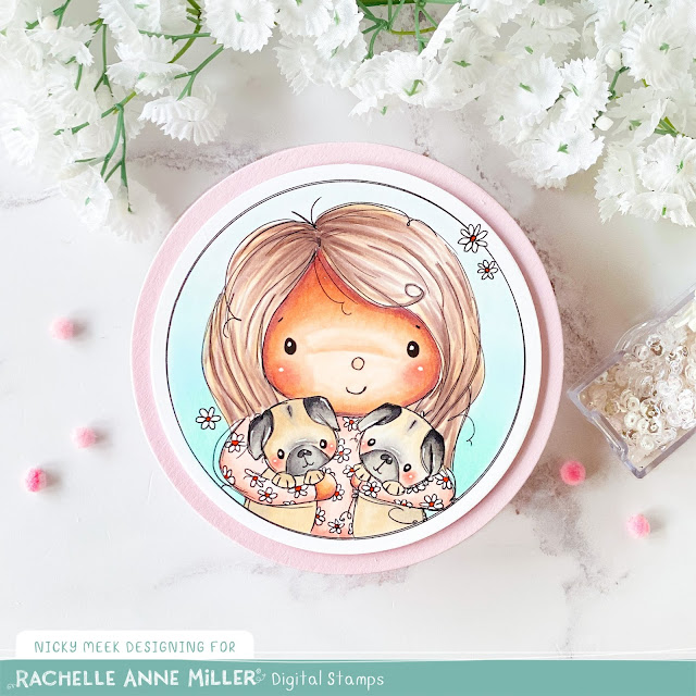 Something fun and different today and just a little bit weird for me because this illustrated stamp by Rachelle Anne Miller Creative Studios is a digital stamp of yours truly!!! Just a nice little perk of being on Rachelle's Design Team we had our profile pics illustrated and this is me with my two beloved Pugs.