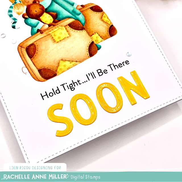 For the sentiment, I cut out S O O N using the Charlie Alpha Die from Hello Bluebird from buttercup card stock. The rest of the sentiment, I stamped on the panel directly (sentiment is from the High-Flying Adventure stamp from MFT). I added everything together on a card base. To finish the panel, I added some glossy accents onto the SOON. I hope you like it xxx