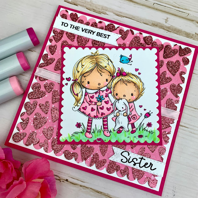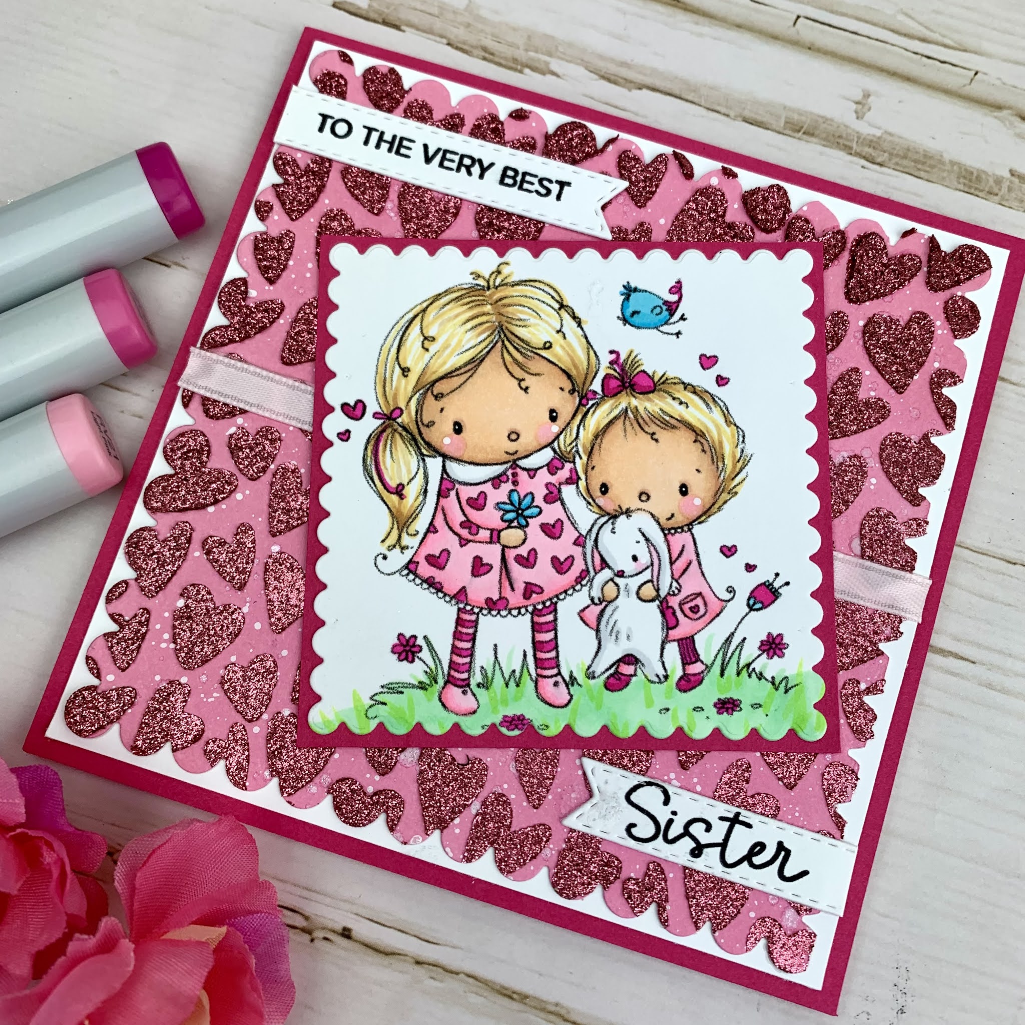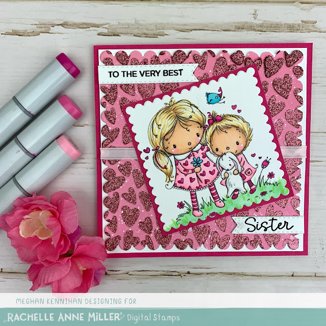 It's NEW RELEASE time at Rachelle Anne Miller Creative Studios! I am sharing the Sisters stamp with you today. I was inspired by old photos of me and my identical twin sister (see below).