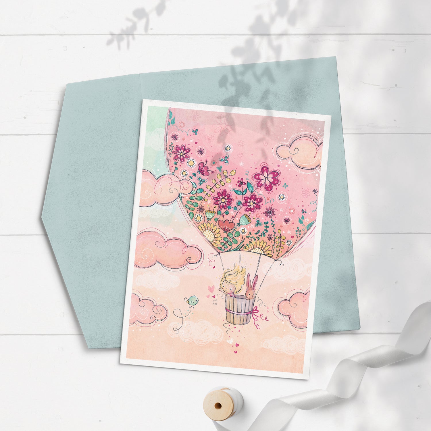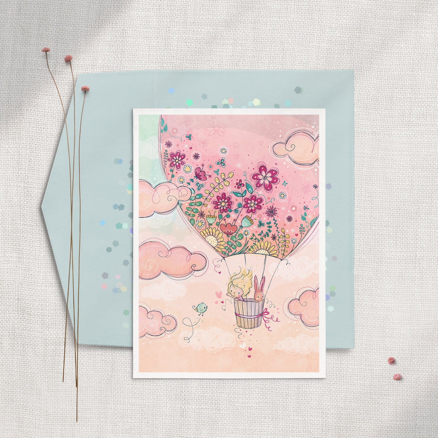 A little girl and her pet bunny rabbit drift off into the sunset in a hot air balloon while being greeted by a little flying friend! This children's greeting card is perfect for a little girl's birthday or to compliment a baby shower gift!