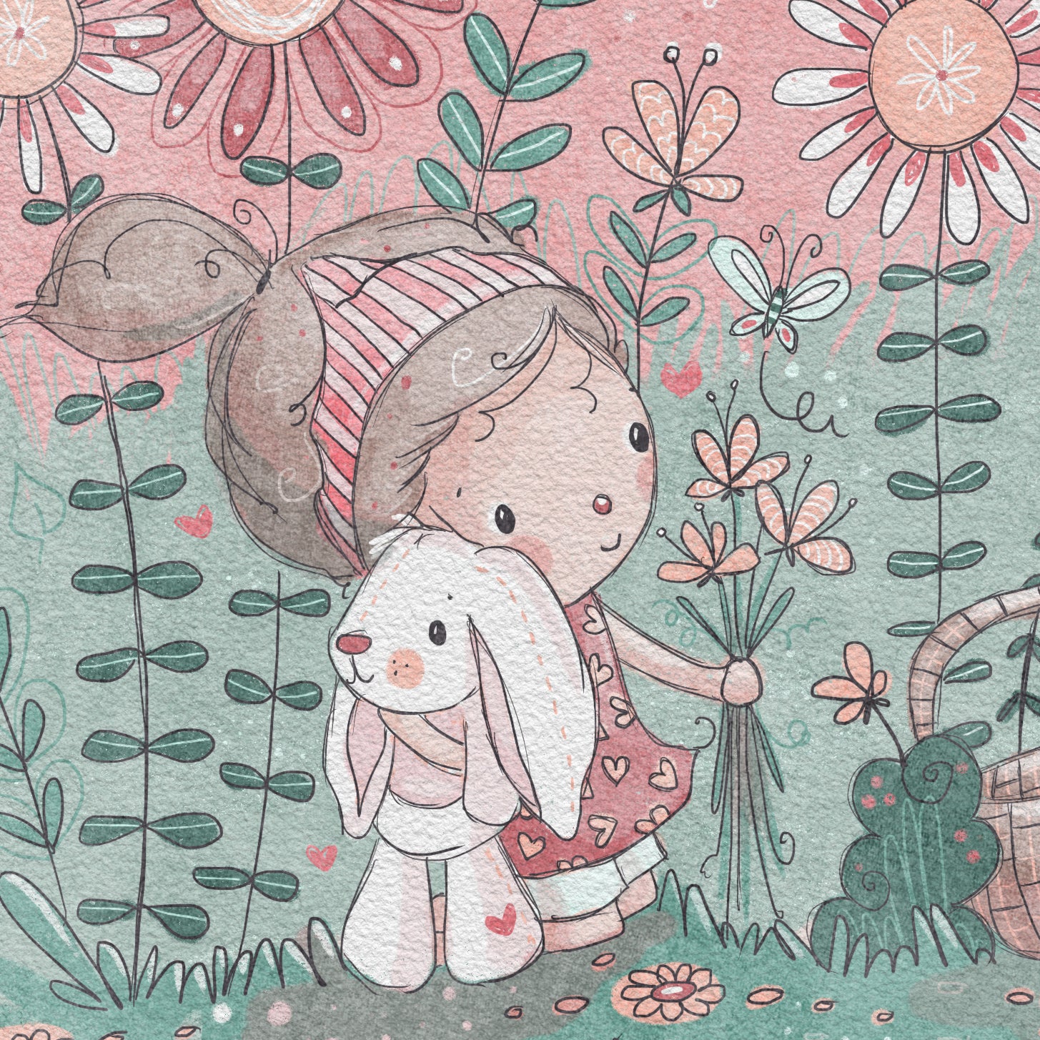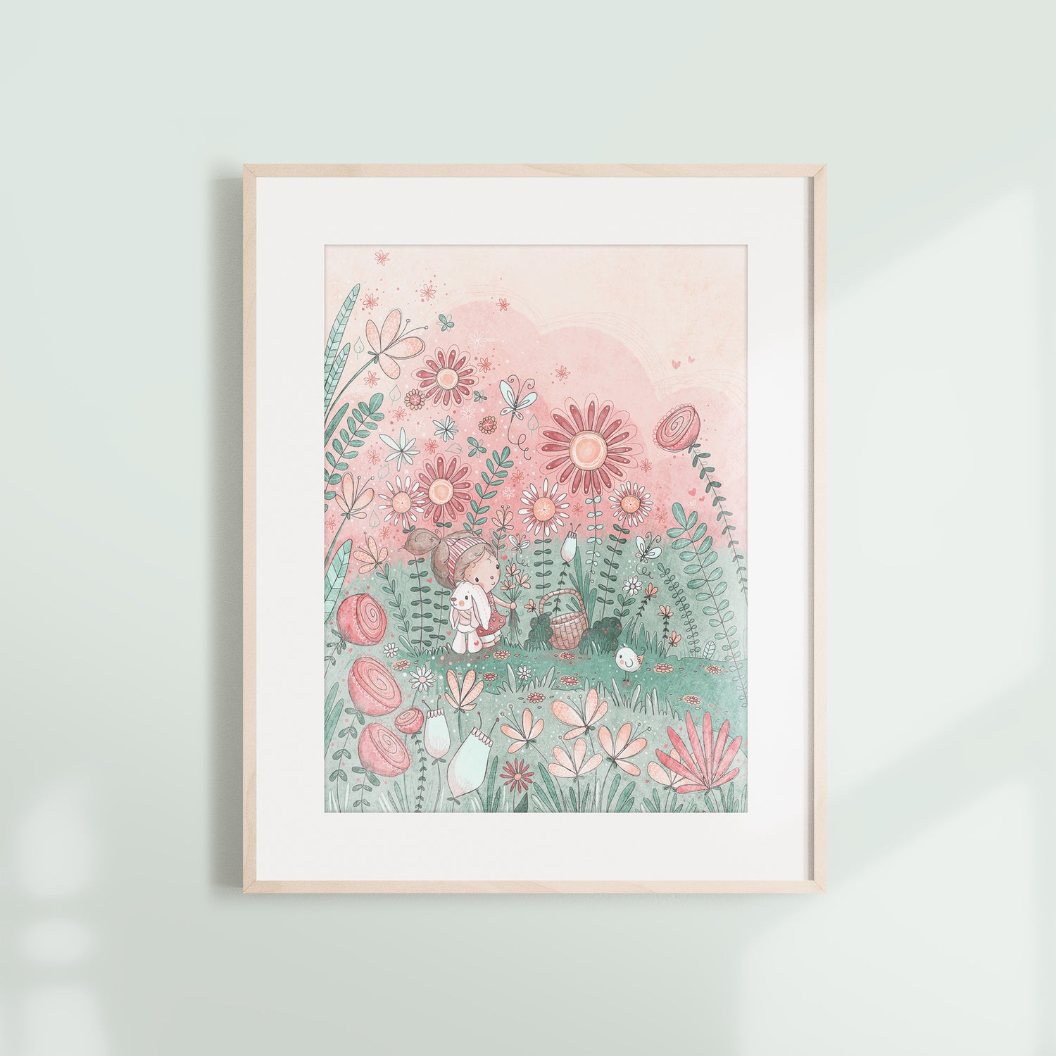 A sweet little girl and her pet bunny rabbit enjoy an afternoon in the garden picking flowers. This wall art print is perfect for a little girl's bedroom or nursery!