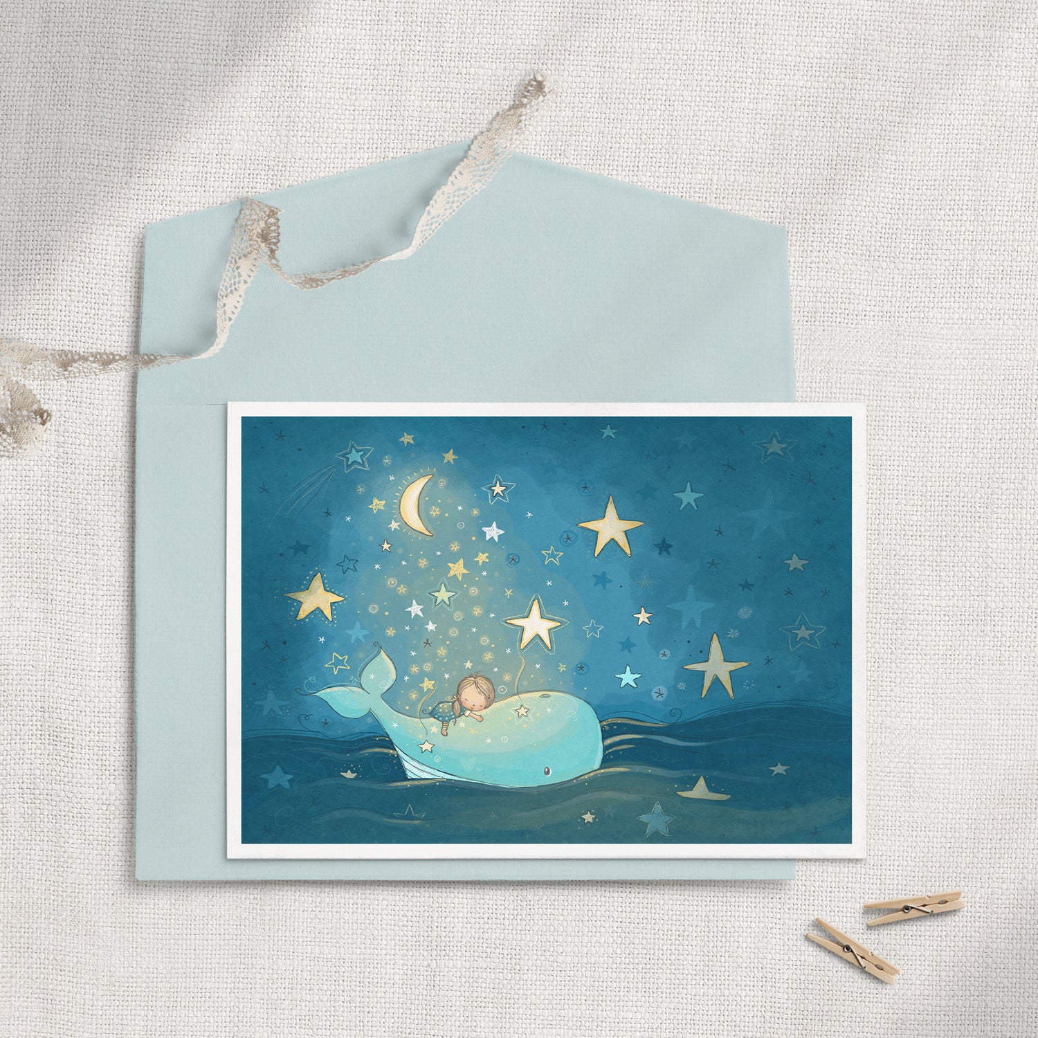 A little girl dreams of softly floating on a whale surrounded by the brightest night sky! This children's greeting card is perfect for a little girl or boy's birthday or to compliment a baby shower gift!
