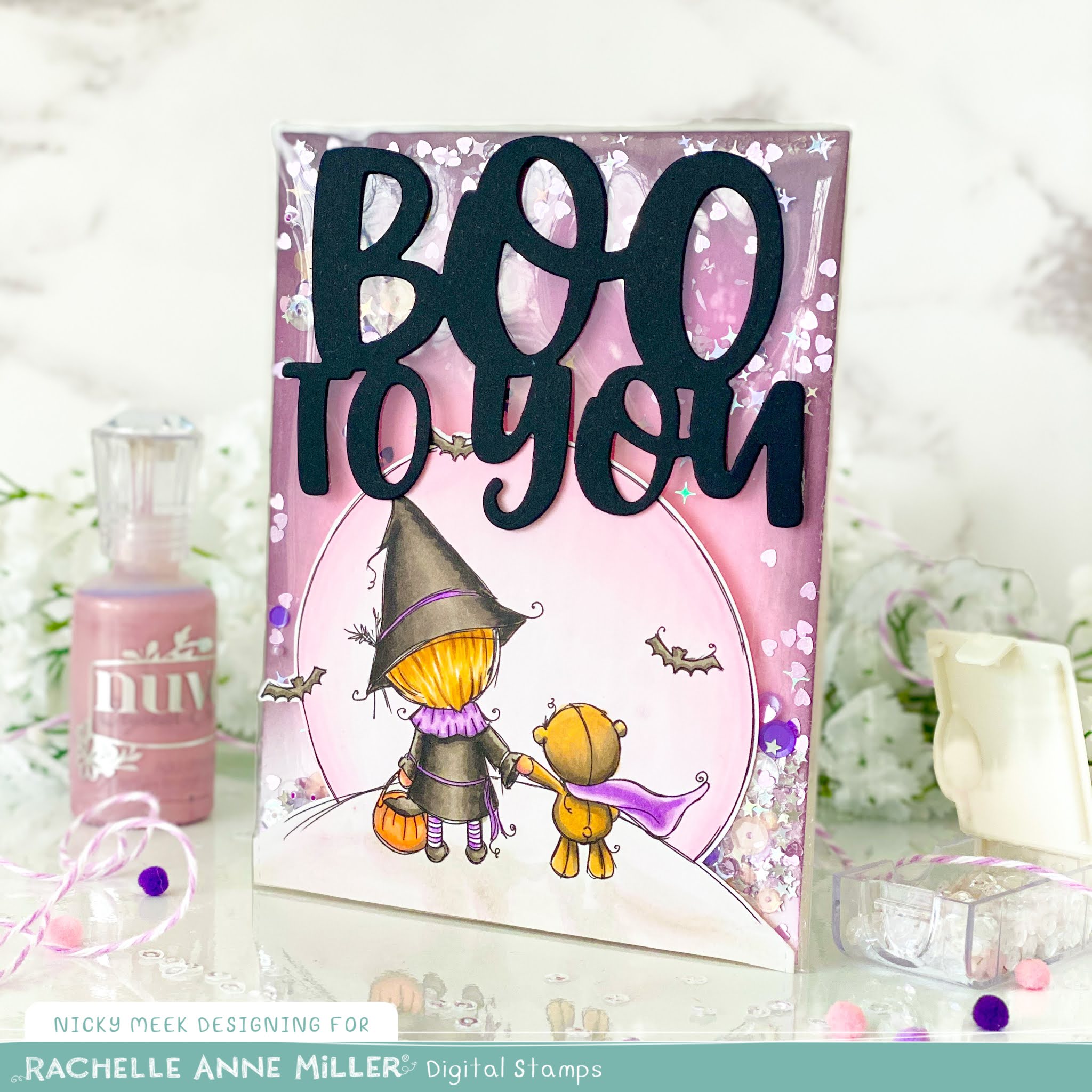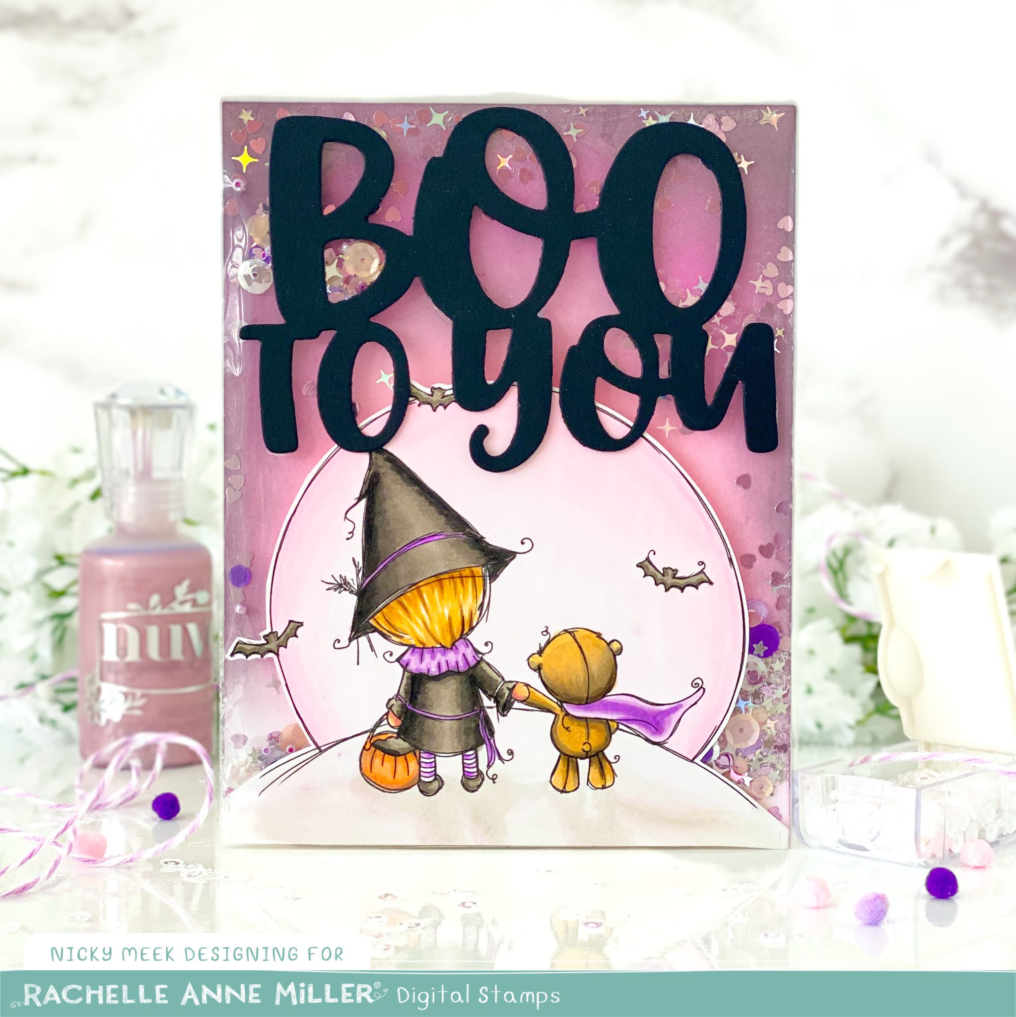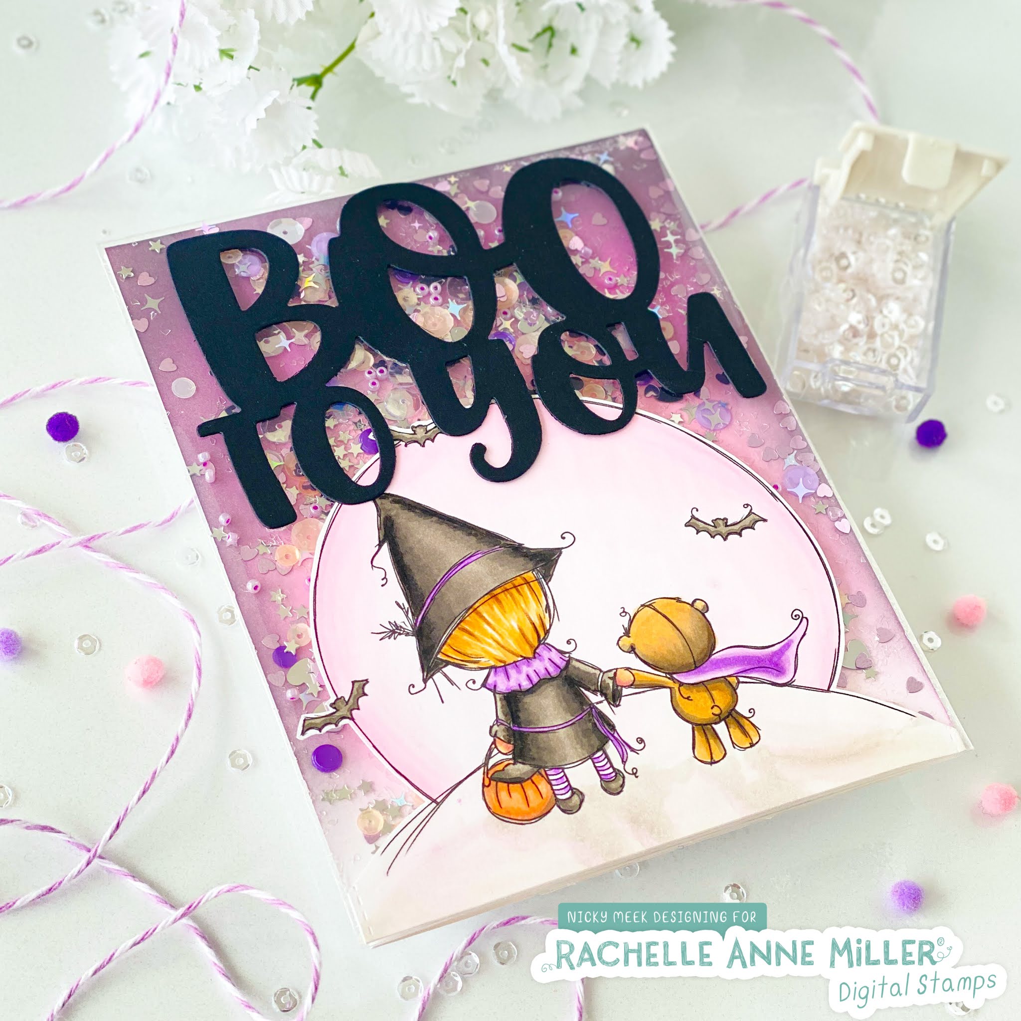 Hello, I have a fun infinity shaker Halloween card for you today using the digital stamp image called Halloween Moon by Rachelle Anne Miller Creative Studio. This is a digital stamp, so you just click and buy, it is delivered to your email address virtually immediately and you can then proceed to print the image using your home printer and immediately have some creative fun with it!