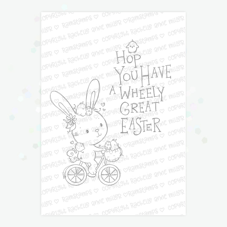 This listing is for a digital stamp (PNG Format) from Rachelle Anne Miller. Perfect for handmade cards, papercrafts, kid's colouring pages, and more, these whimsical hand-drawn digital stamps are the ideal cute and unique touch for your creative project. This stamp includes a bunny riding a bike with his chick friends.