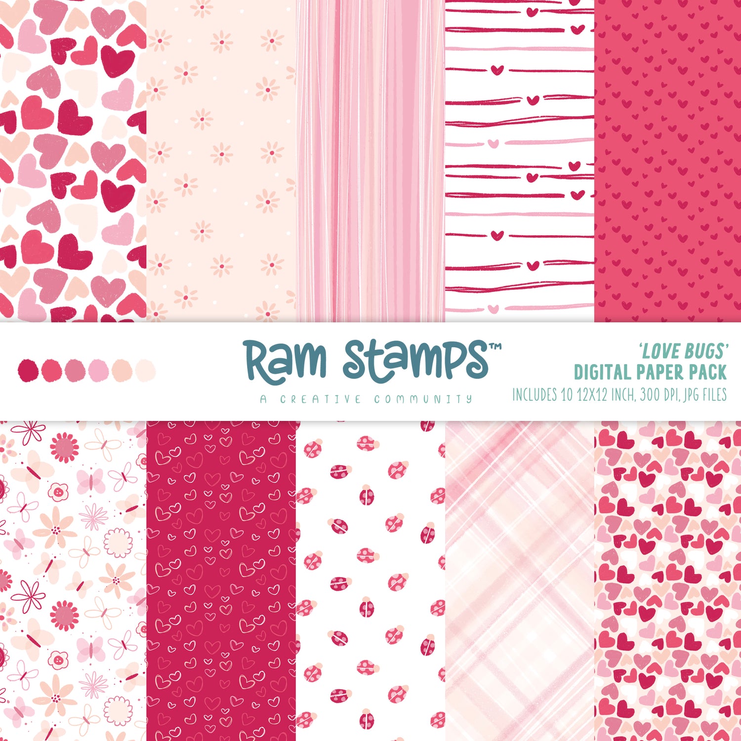 This listing is for ten 12x12 inch (3600x3600px) digital pattern paper files (300 DPI, JPGs) from Rachelle Anne Miller. These digital papers coordinate perfectly with RAM Stamps and are ideal for your next handmade card, scrapbook page, or papercraft project.