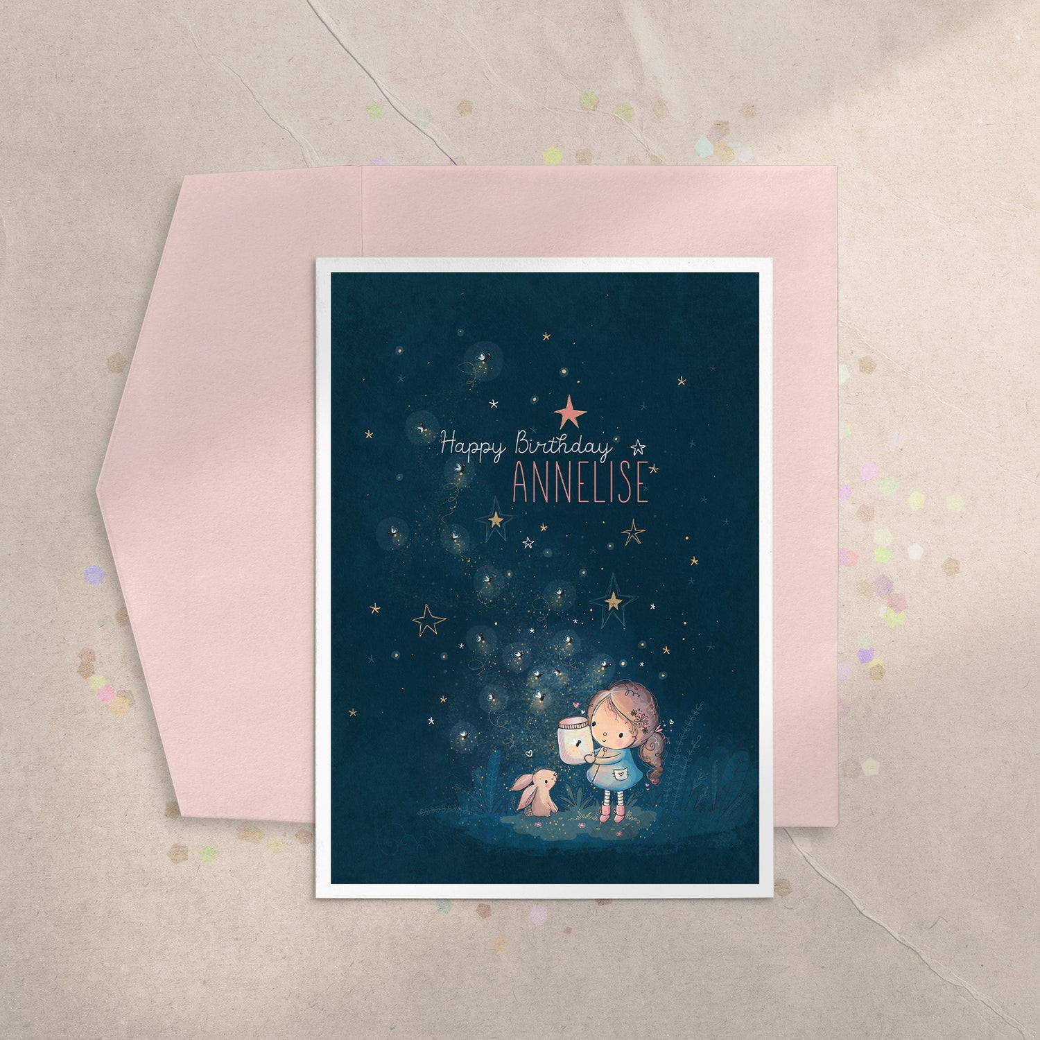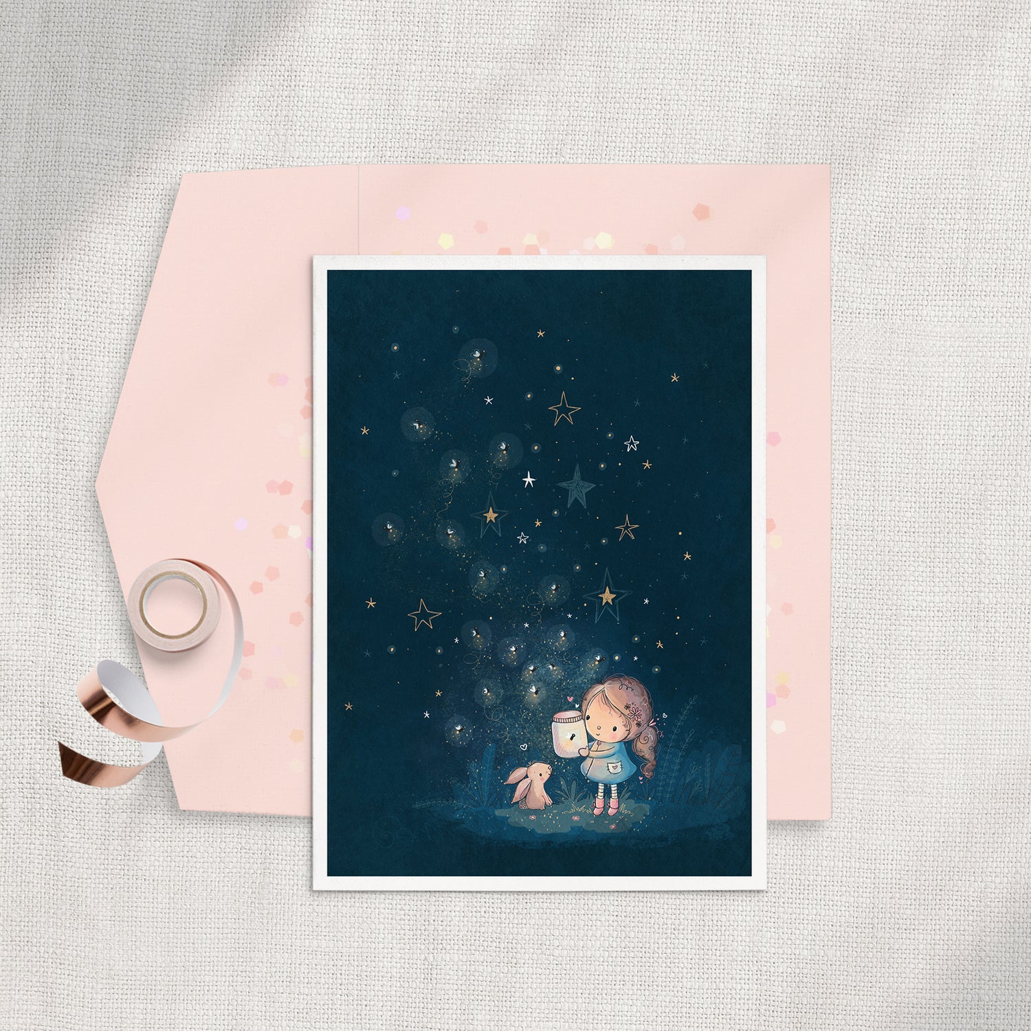 A magical evening for a little girl and her pet bunny rabbit as they capture tiny fireflies that light up the night sky! This children's greeting card is perfect for a little girl's birthday or to compliment a baby shower gift.