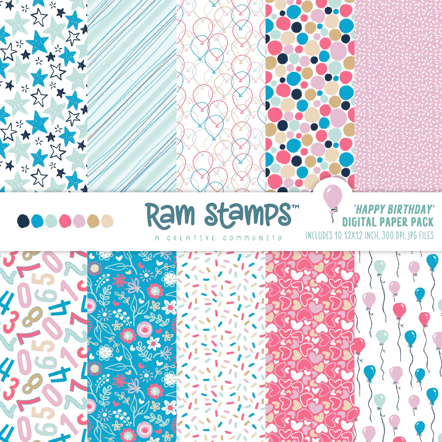 This listing is for ten 12x12 inch (3600x3600px) digital pattern paper files (300 DPI, JPGs) from Rachelle Anne Miller. These digital papers coordinate perfectly with RAM Stamps and are ideal for your next handmade card, scrapbook page, or papercraft project.
