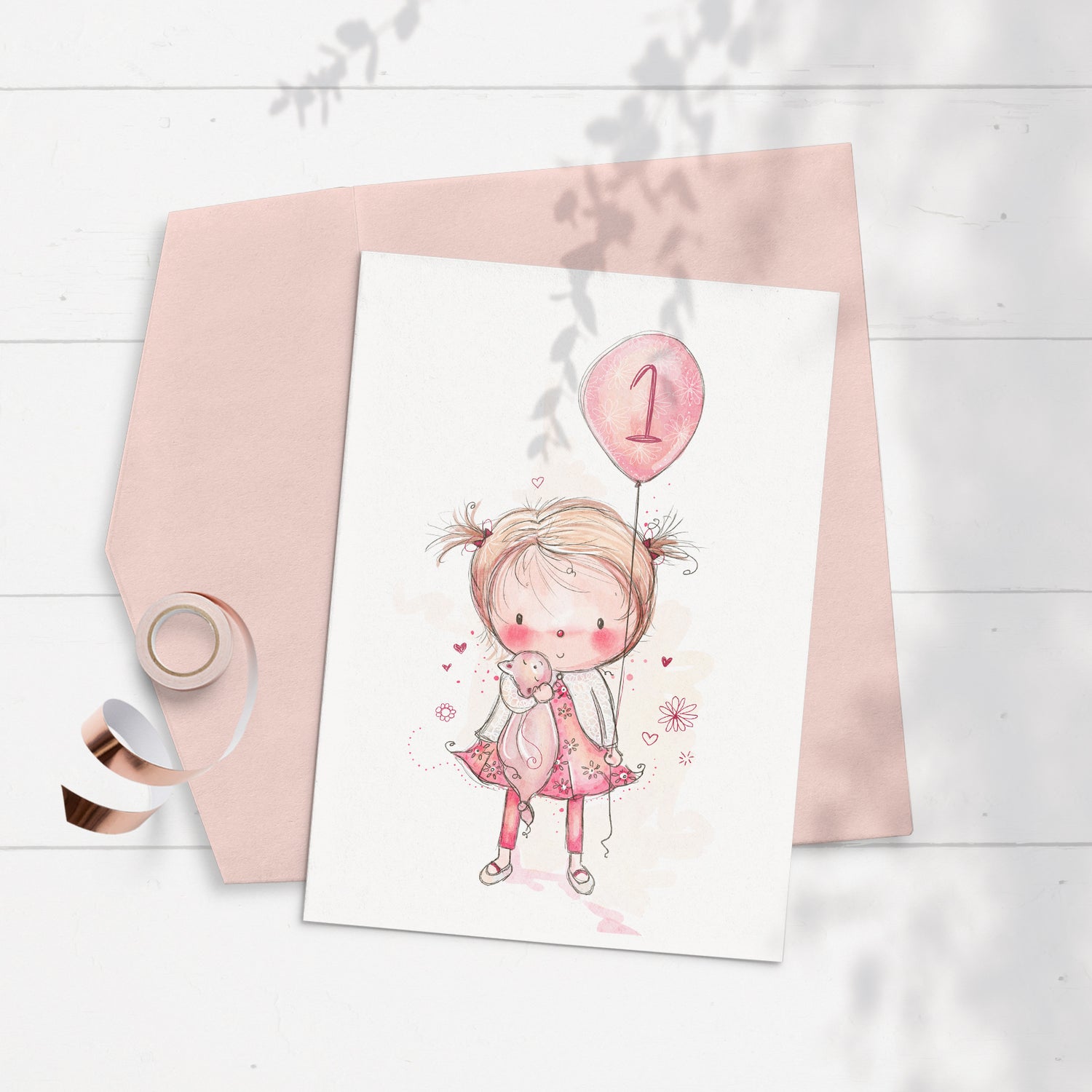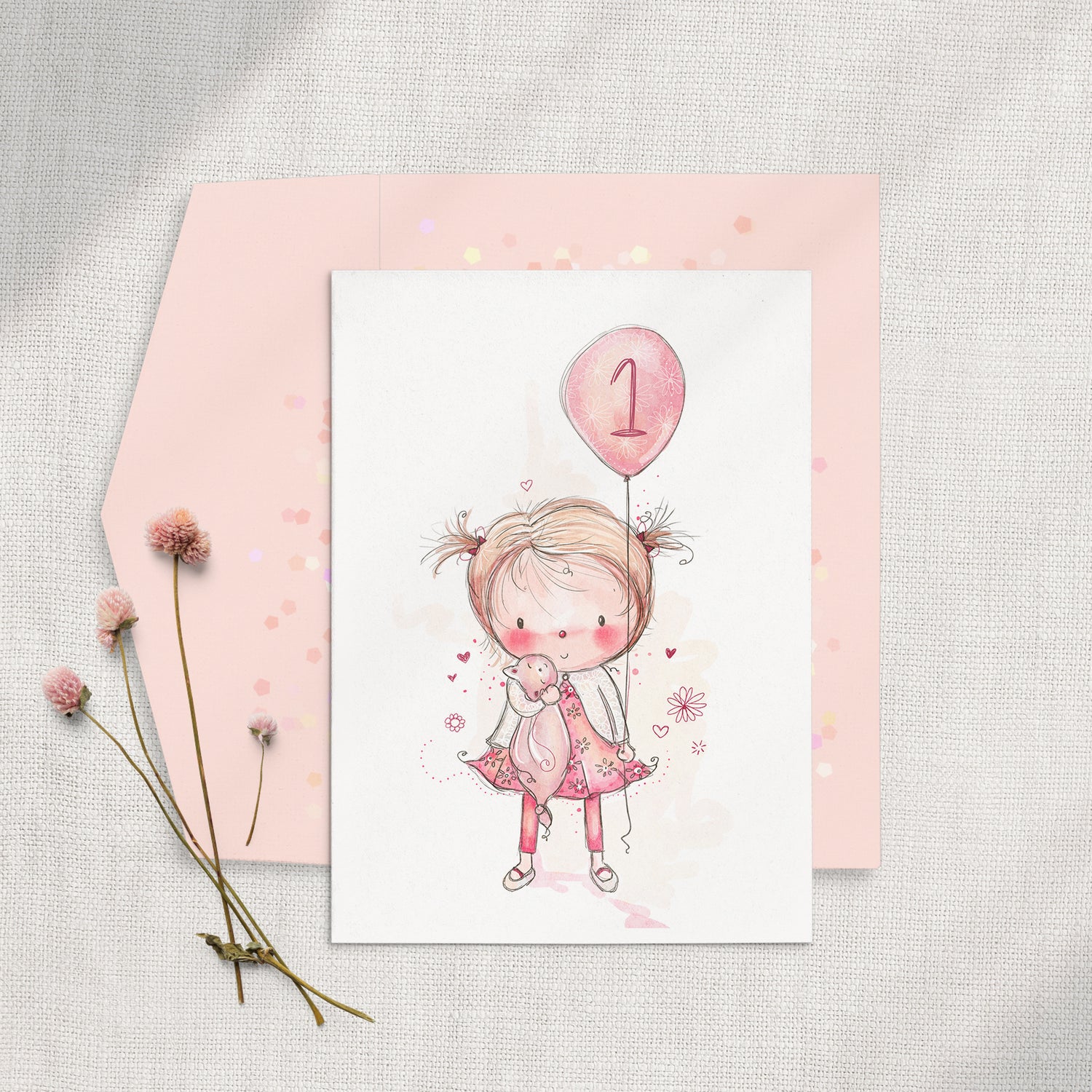 Personalize this sweet card by choosing the number in the balloon or request to remove the number. This children's greeting card is perfect for a little girl's birthday or to compliment a baby shower gift!