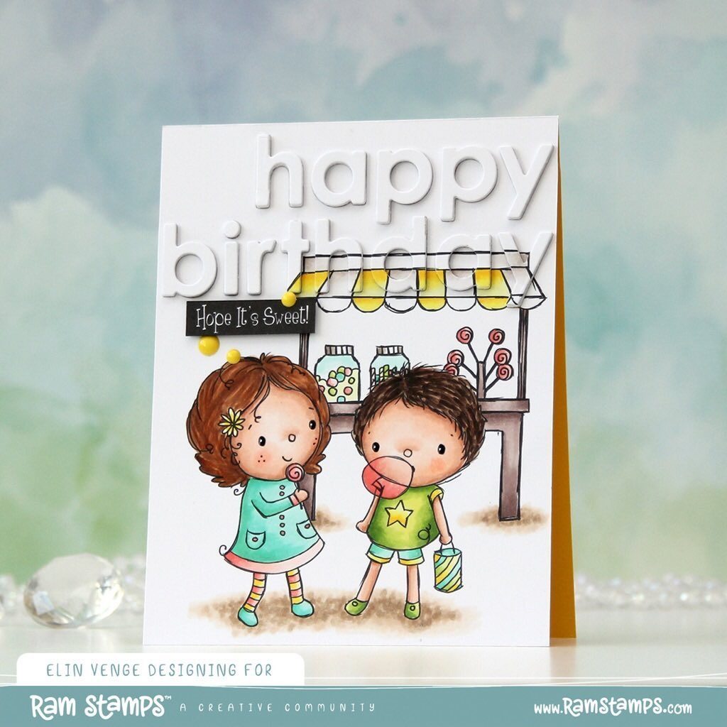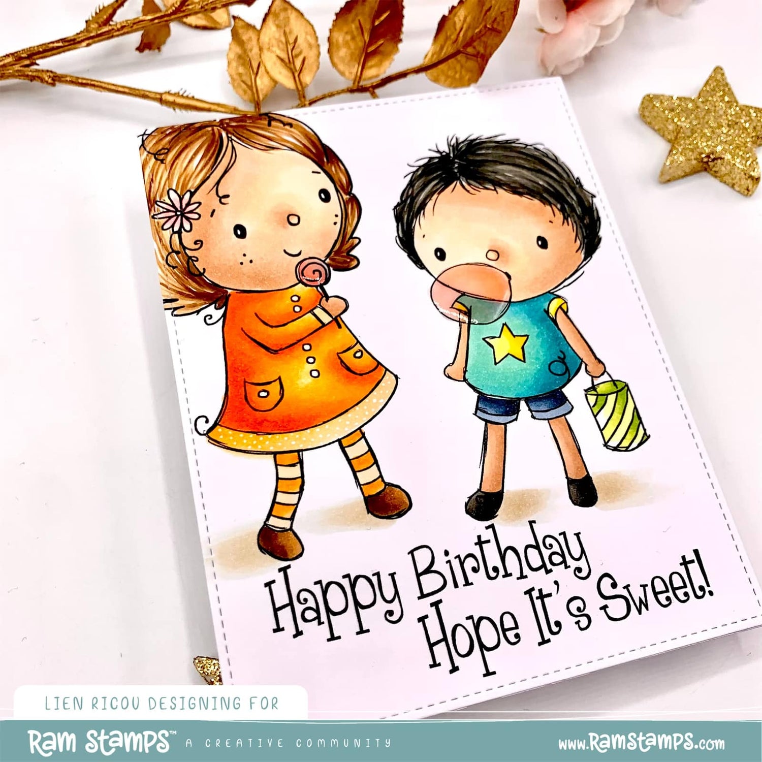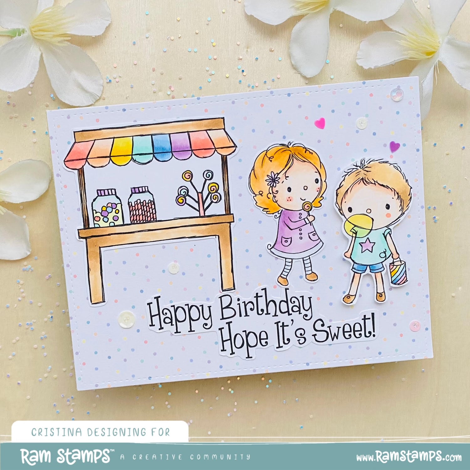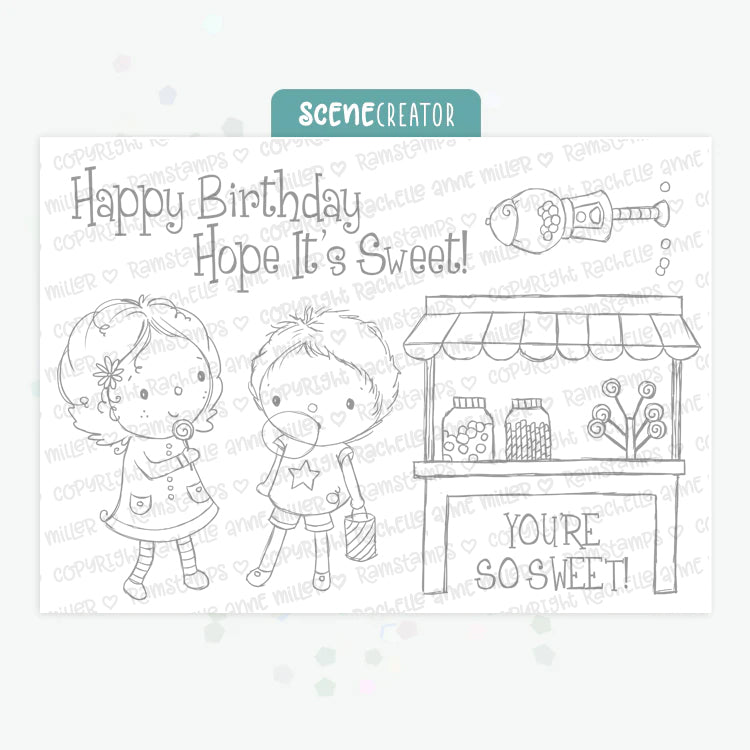This listing is for 14 digital stamps (PNG Format) from Rachelle Anne Miller. Perfect for handmade cards, papercrafts, kid's colouring pages, and more, these whimsical hand-drawn digital stamps are the ideal cute and unique touch for your creative project. This set includes a little boy and girl character with a candy shop and a bubble gum stand!