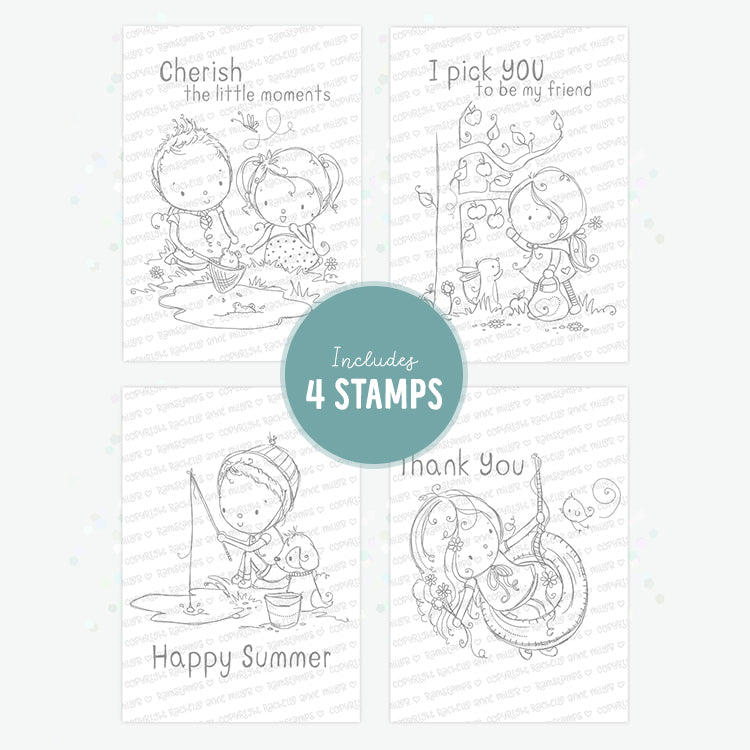 This listing is for 4 digital stamps (PNG Format) from Rachelle Anne Miller. Perfect for handmade cards, papercrafts, kid's colouring pages, and more, these whimsical hand-drawn digital stamps are the ideal cute and unique touch for your creative project! This set includes little kids, ponds, frogs, tire swings, fishing, puppy dogs, apple trees, and bunny rabbits!