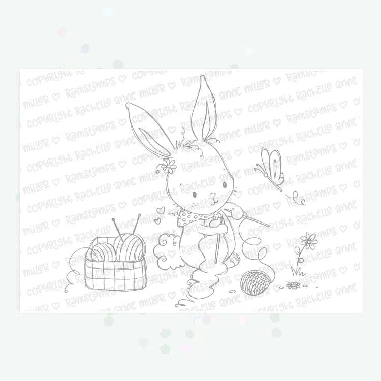 This listing is for a digital stamp (PNG Format) from Rachelle Anne Miller. Perfect for handmade cards, papercrafts, kid's colouring pages, and more, these whimsical hand-drawn digital stamps are the ideal cute and unique touch for your creative project. A cute bunny is knitting a blanket in the garden!