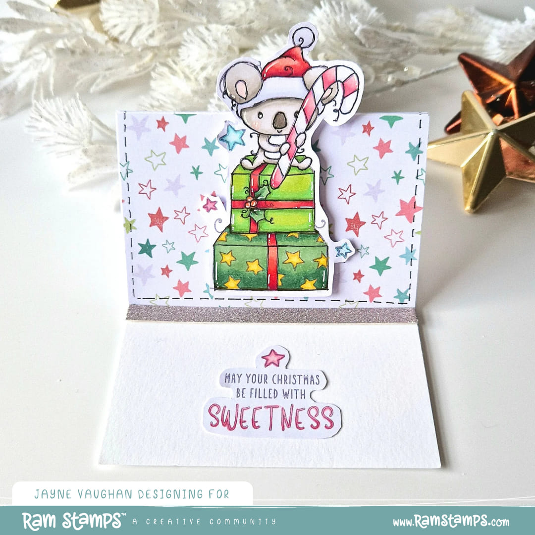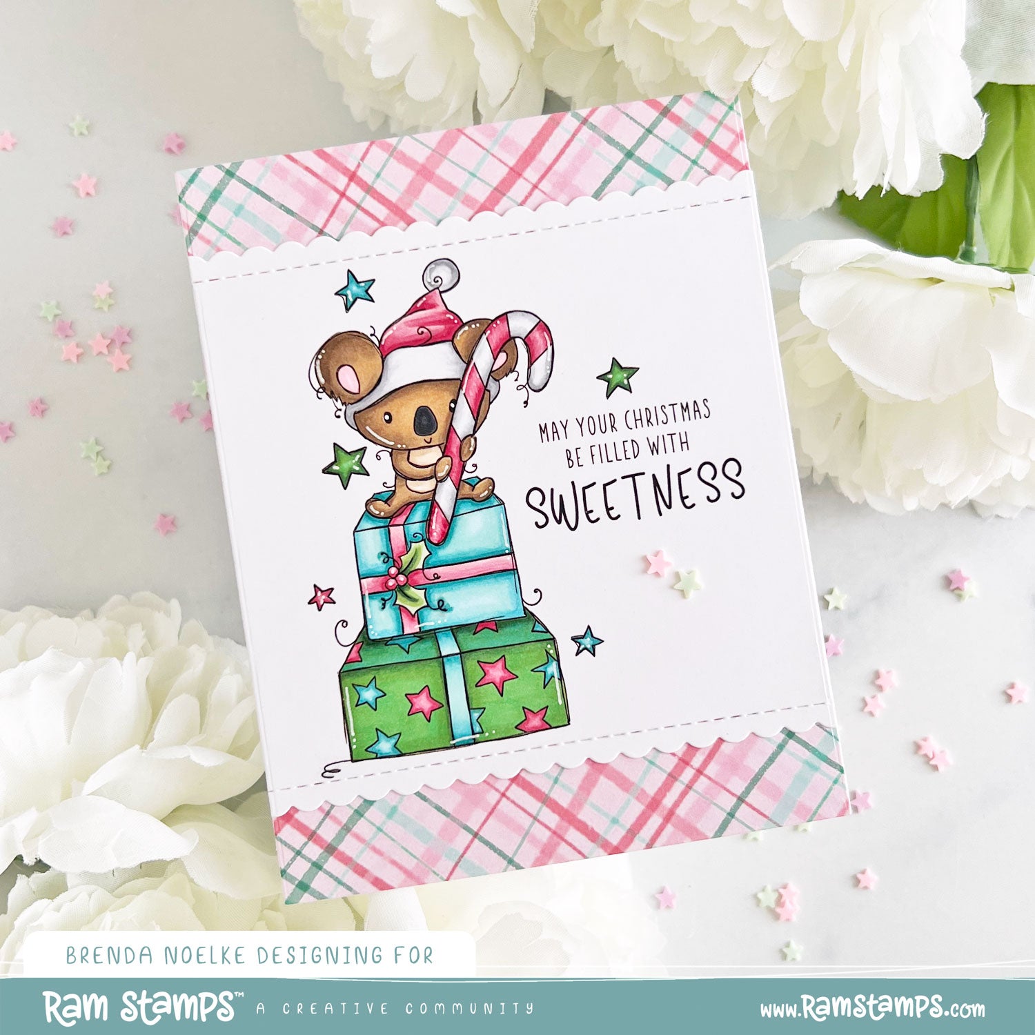 This listing is for a digital stamp (PNG Format) from Rachelle Anne Miller. Perfect for handmade cards, papercrafts, kid's colouring pages, and more, these whimsical hand-drawn digital stamps are the ideal cute and unique touch for your creative project! This stamp includes a cute koala holding a candy cane on top of two Christmas gifts.
