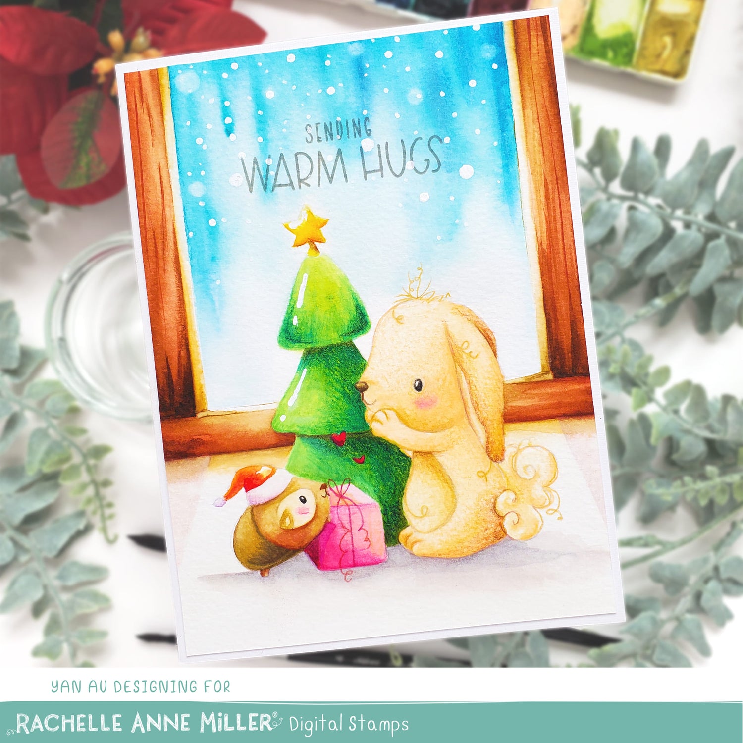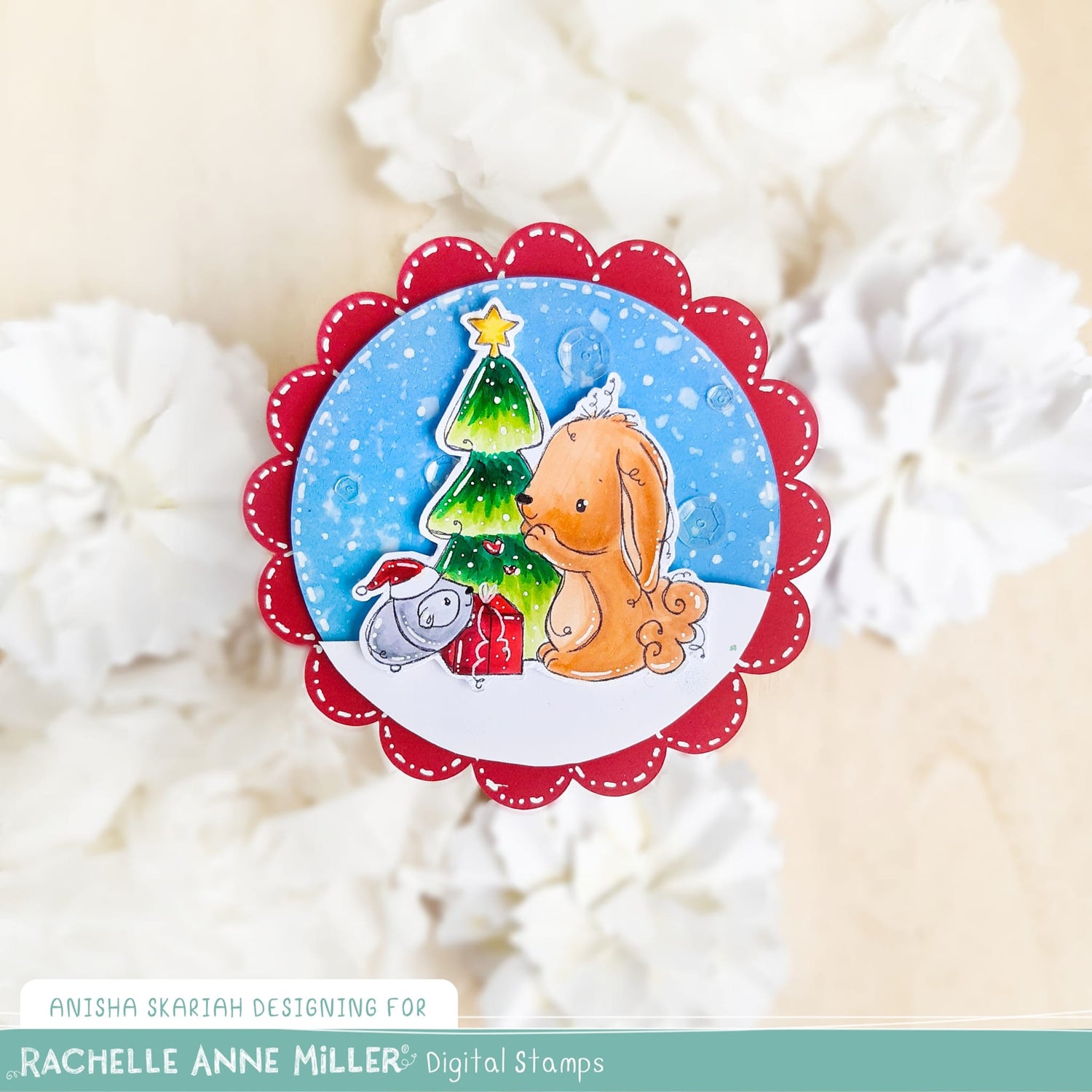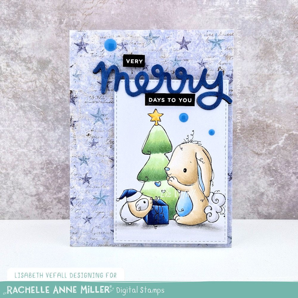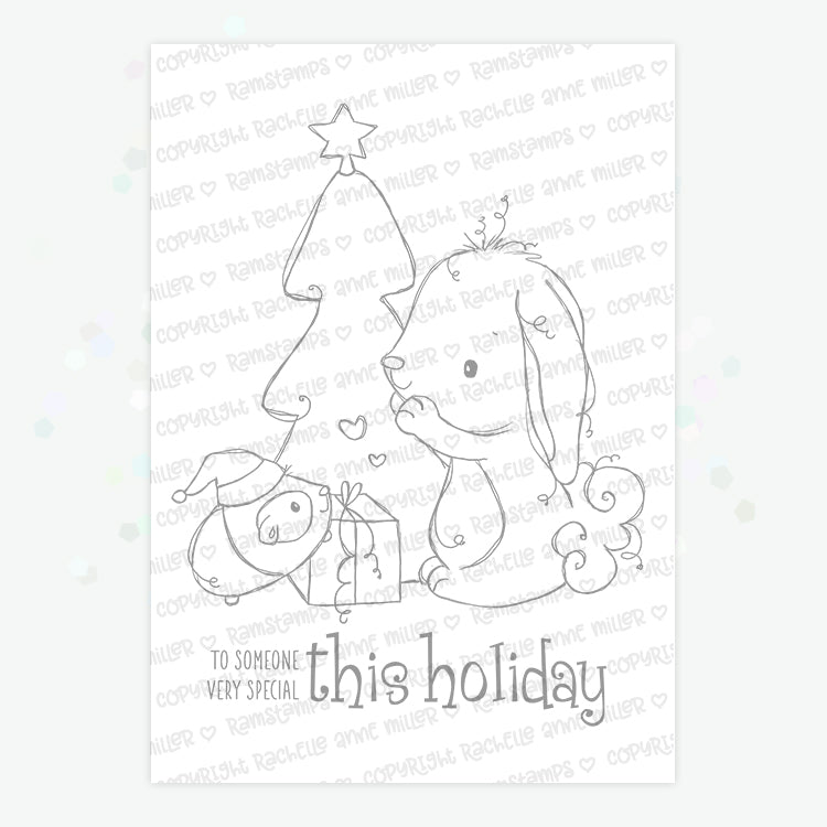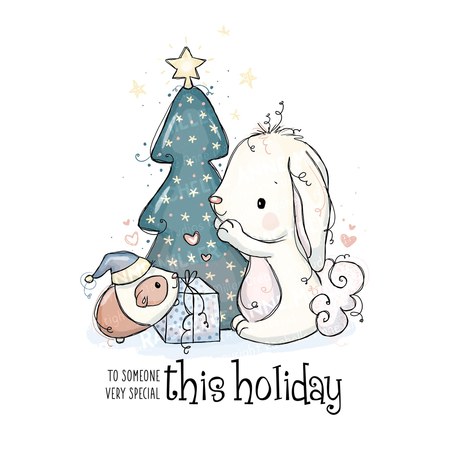 This listing is for a digital stamp (PNG Format) from Rachelle Anne Miller. Perfect for handmade cards, papercrafts, kid's colouring pages, and more, these whimsical hand-drawn digital stamps are the ideal cute and unique touch for your creative project! This stamp includes Guinea gifting Bunny a holiday gift in front of their Christmas tree.