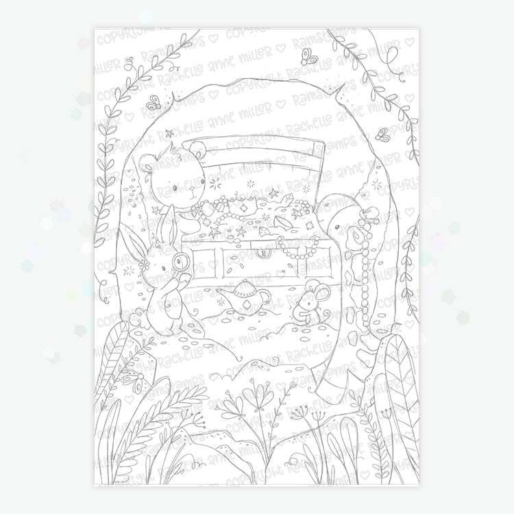 This listing is for a full colouring page (5x7" High-Resolution JPG) from Rachelle Anne Miller. Three best friends discover a hidden treasure chest inside a flowery cave!