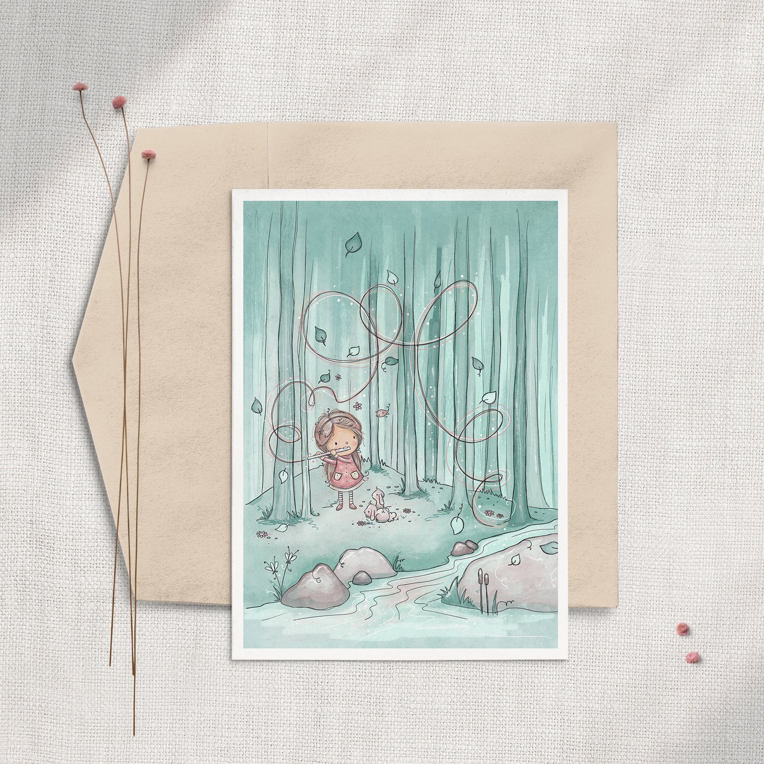 A little girl plays her flute in the forest as two bunnies hop over to listen! This children's greeting card is perfect for a little girl's birthday or to compliment a baby shower gift.