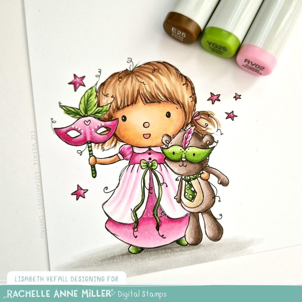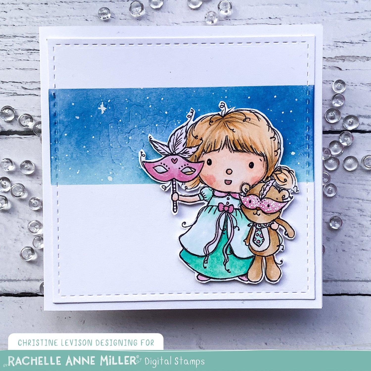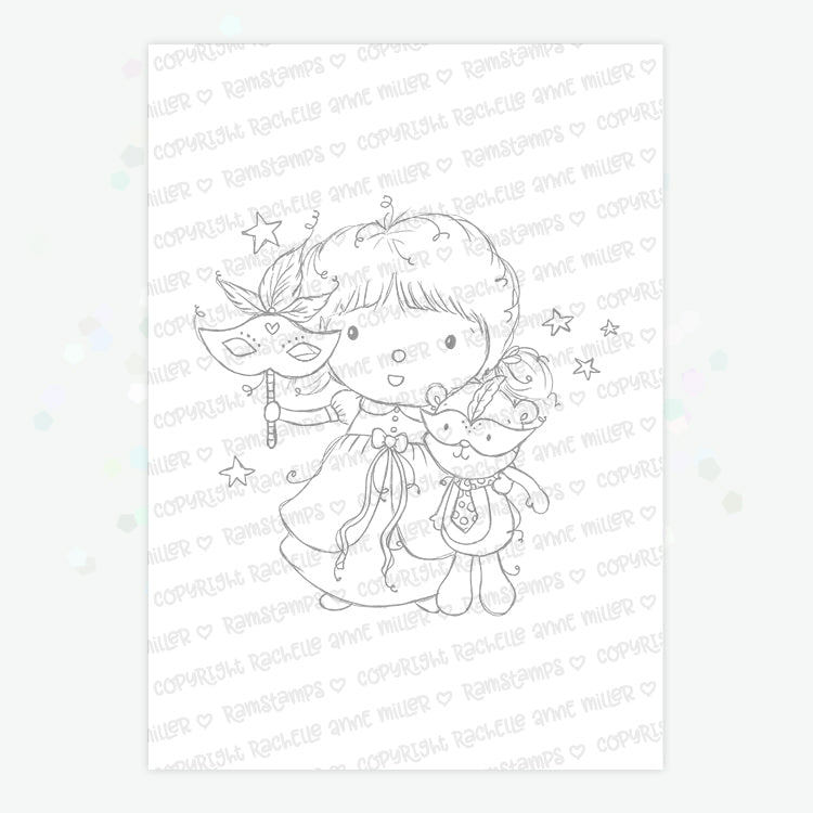 This listing is for a digital stamp (PNG Format) from Rachelle Anne Miller. Perfect for handmade cards, papercrafts, kid's colouring pages, and more, these whimsical hand-drawn digital stamps are the ideal cute and unique touch for your creative project! This stamp includes a little girl dressed up for a masked ball with her teddy bear.