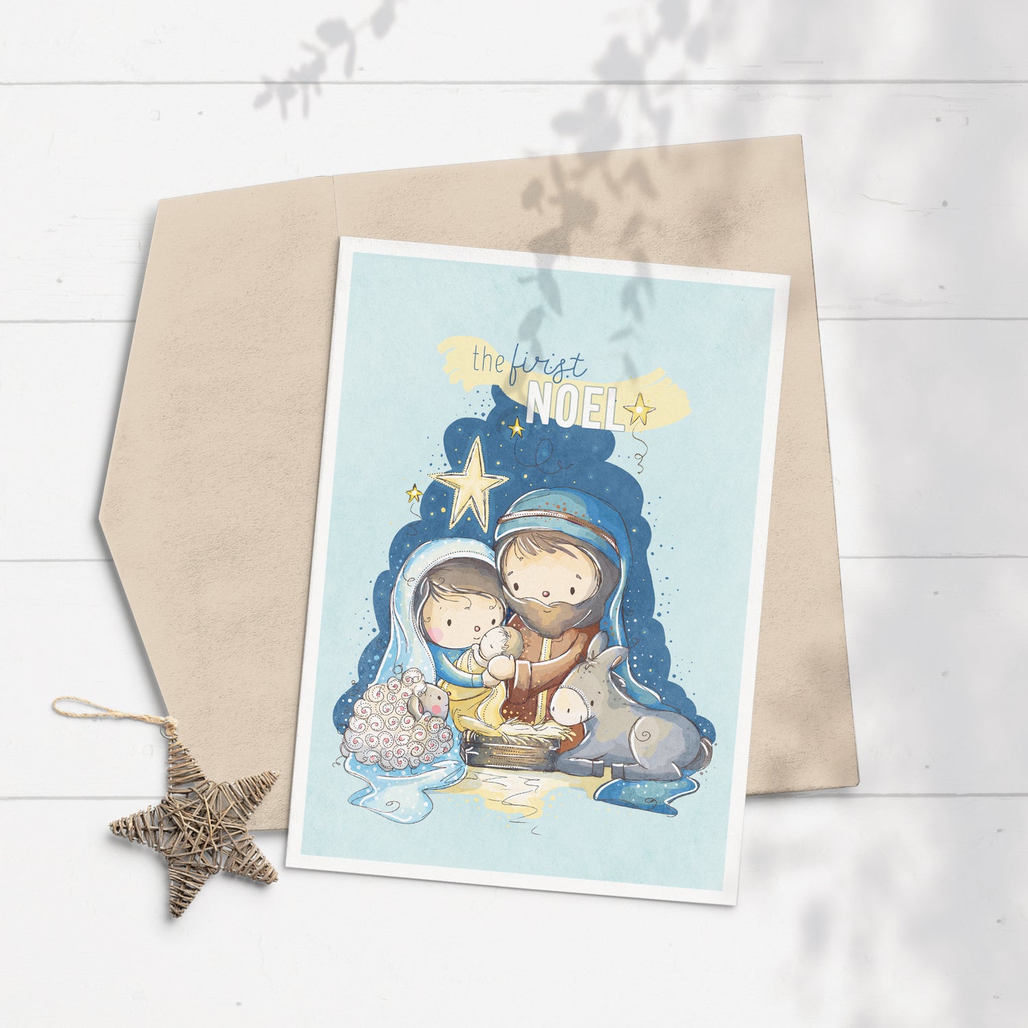 The first Christmas with Mary, Joseph, Baby Jesus, along with a sheep and donkey. Celebrate the holidays with a whimsical and unique greeting card that is perfect for young and old!