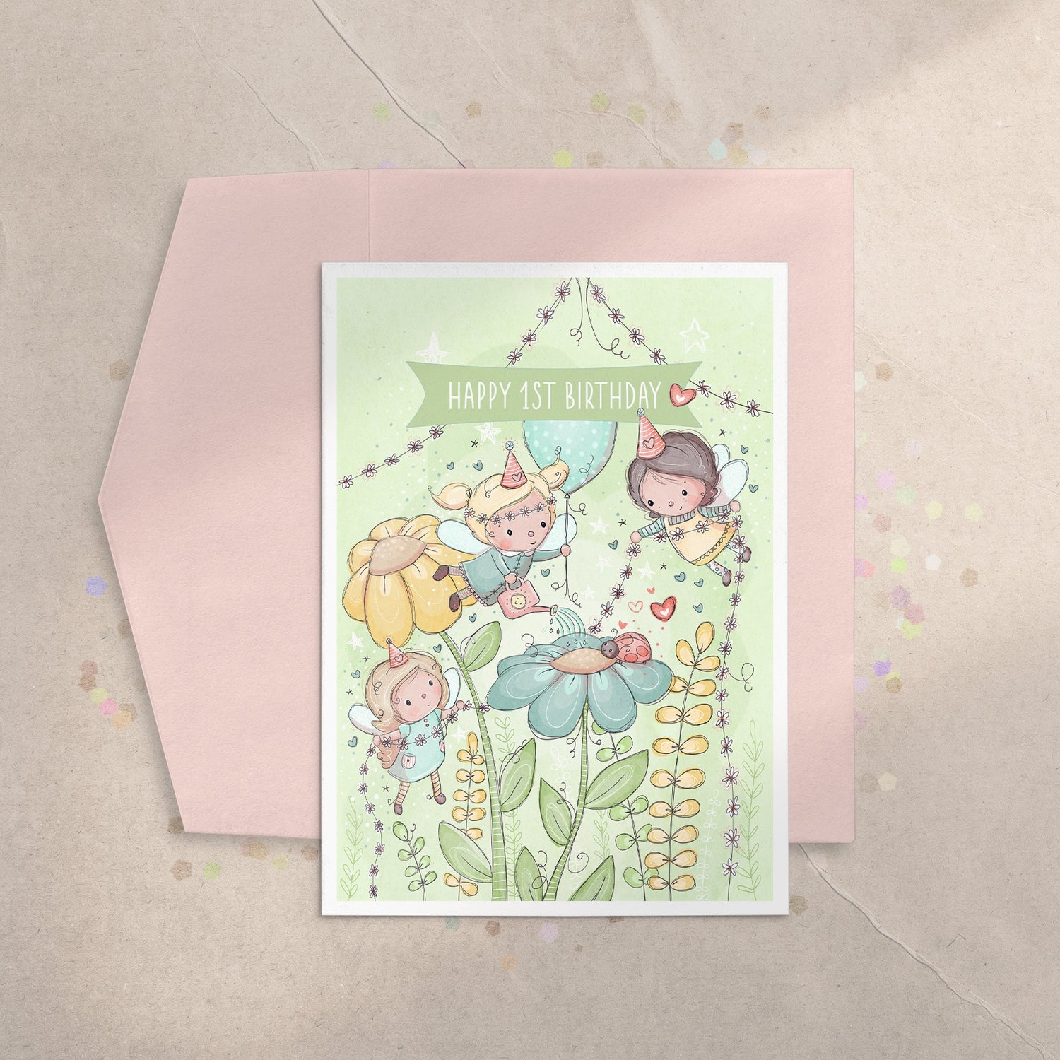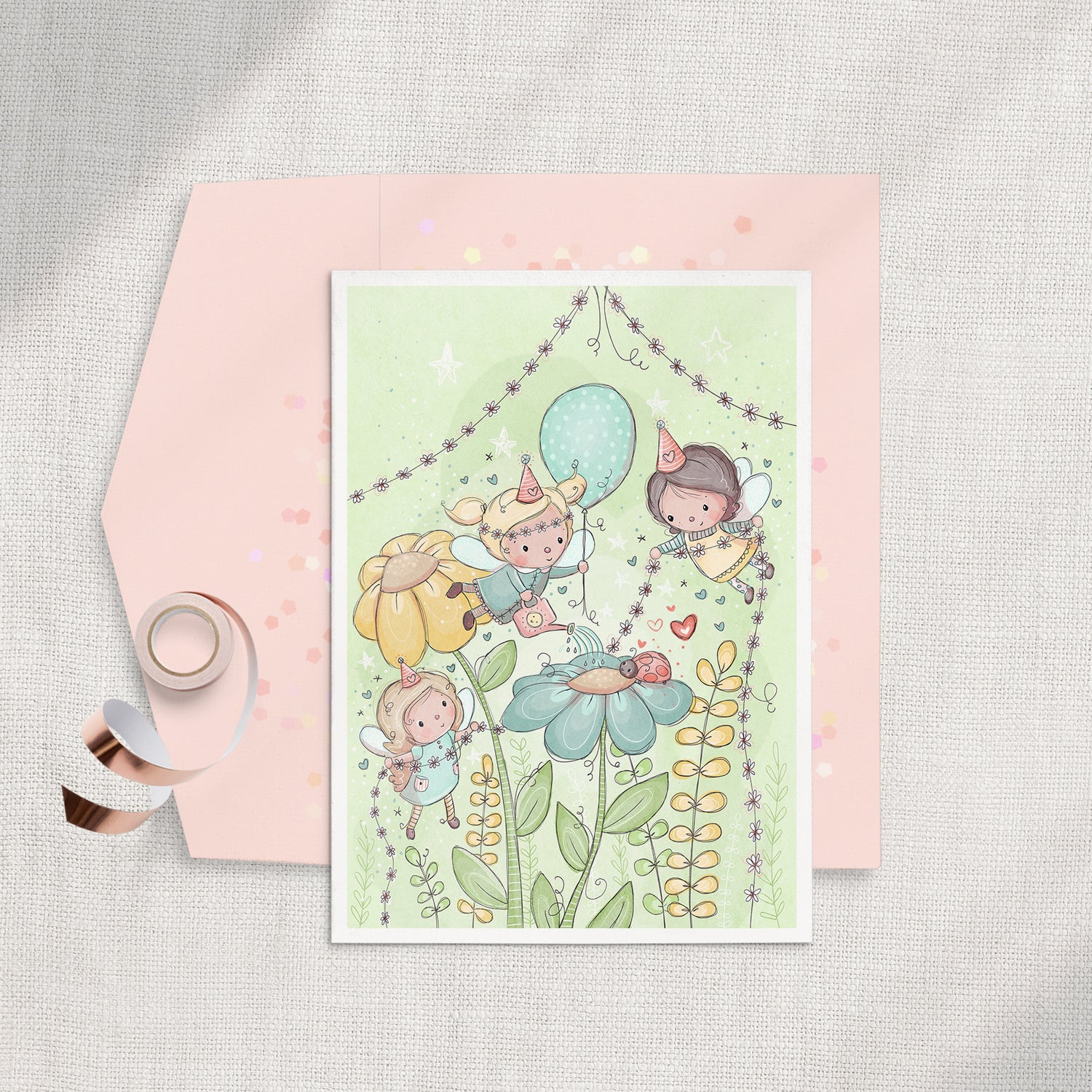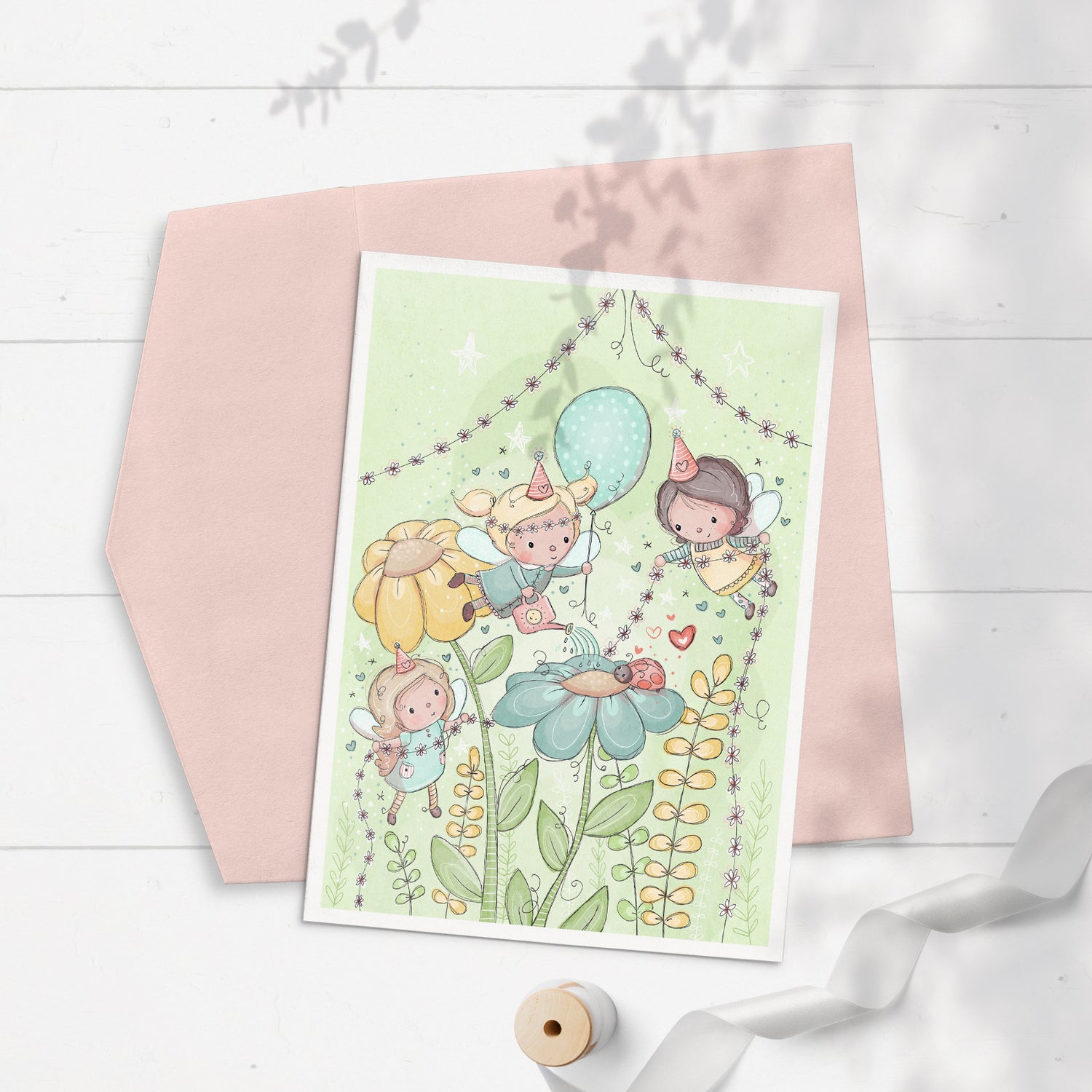 Three fairies excitedly prepare their flower garden for ladybug's birthday party! This children's greeting card is perfect for a little girl’s birthday or to compliment a baby shower gift!