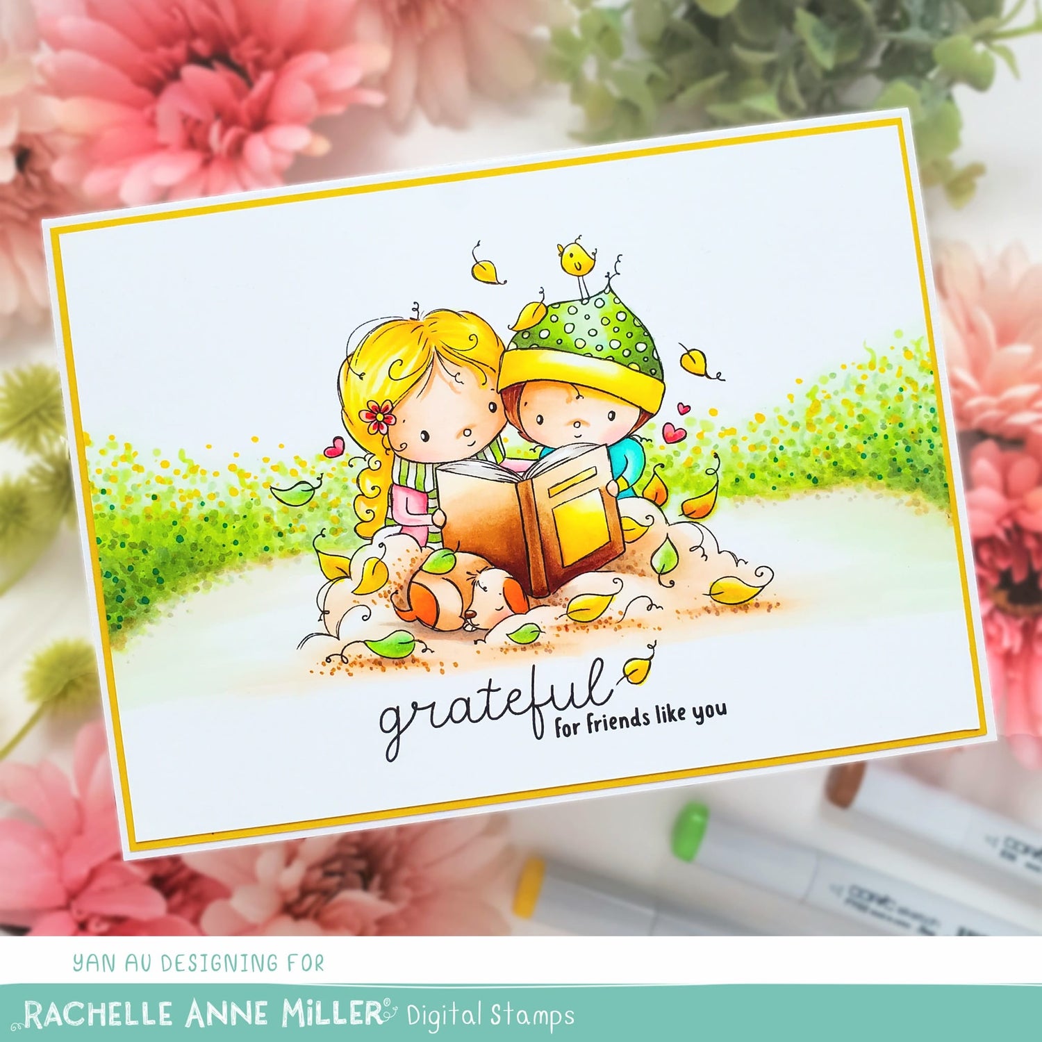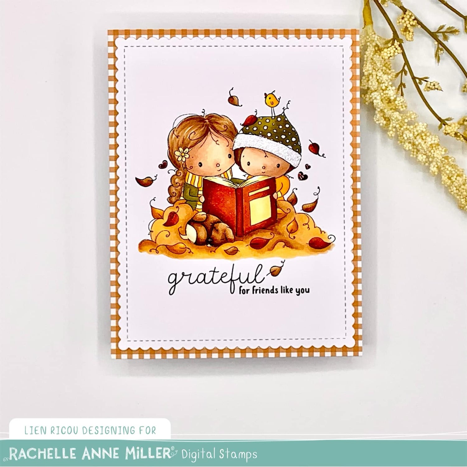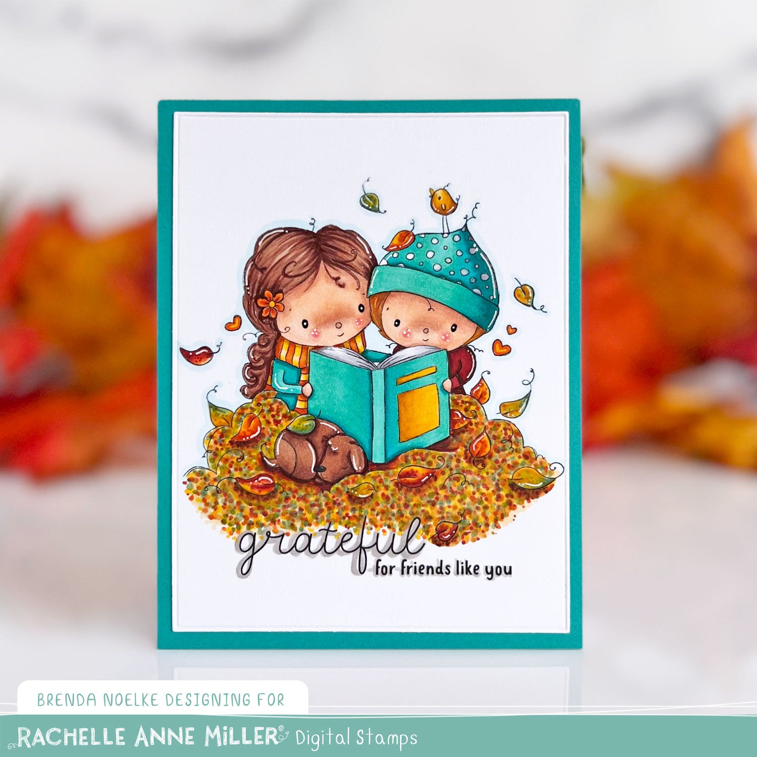 This listing is for a digital stamp (PNG Format) from Rachelle Anne Miller. Perfect for handmade cards, papercrafts, kid's colouring pages, and more, these whimsical hand-drawn digital stamps are the ideal cute and unique touch for your creative project! This stamp includes two children reading a big book in a pile of autumn leaves with their pet puppy by their side.