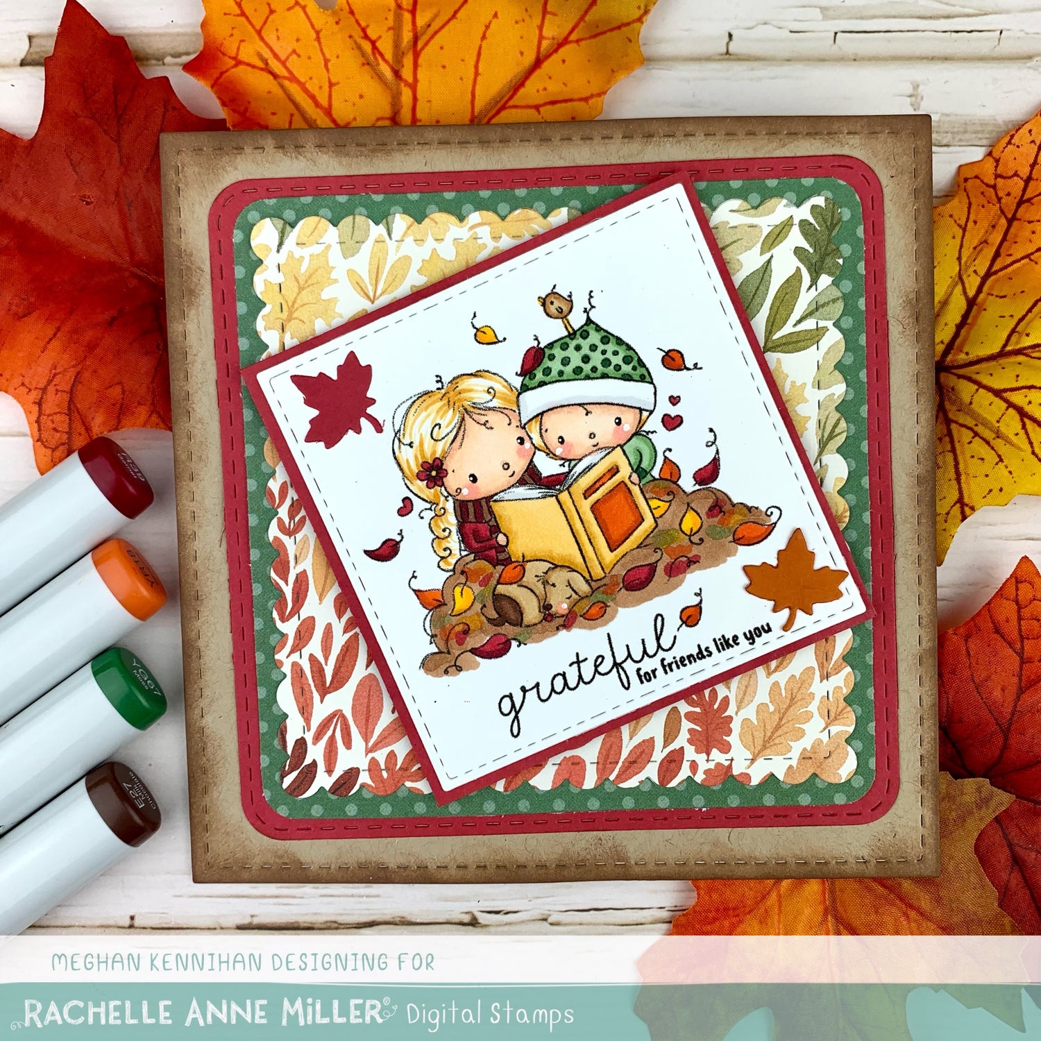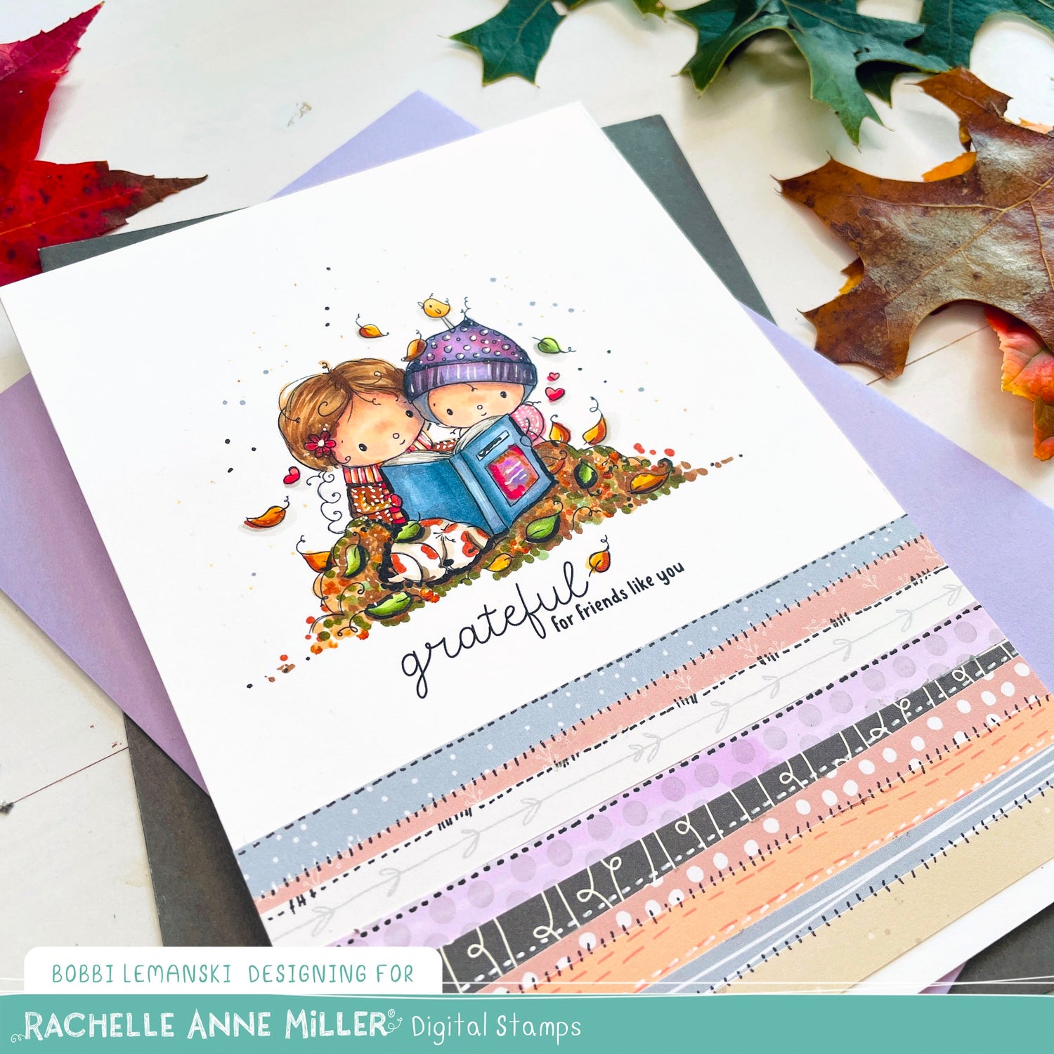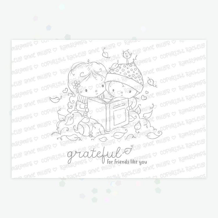 This listing is for a digital stamp (PNG Format) from Rachelle Anne Miller. Perfect for handmade cards, papercrafts, kid's colouring pages, and more, these whimsical hand-drawn digital stamps are the ideal cute and unique touch for your creative project! This stamp includes two children reading a big book in a pile of autumn leaves with their pet puppy by their side.