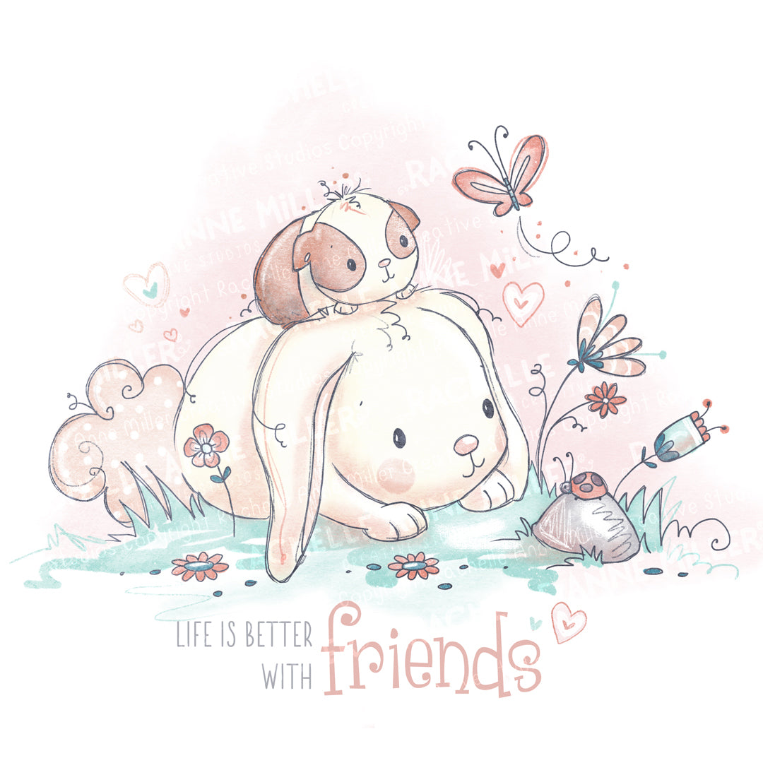 This listing is for a digital stamp (PNG Format) from Rachelle Anne Miller. Perfect for handmade cards, papercrafts, kid's colouring pages, and more, these whimsical hand-drawn digital stamps are the ideal cute and unique touch for your creative project! This stamp includes Bunny & Guinea playing with a ladybug.