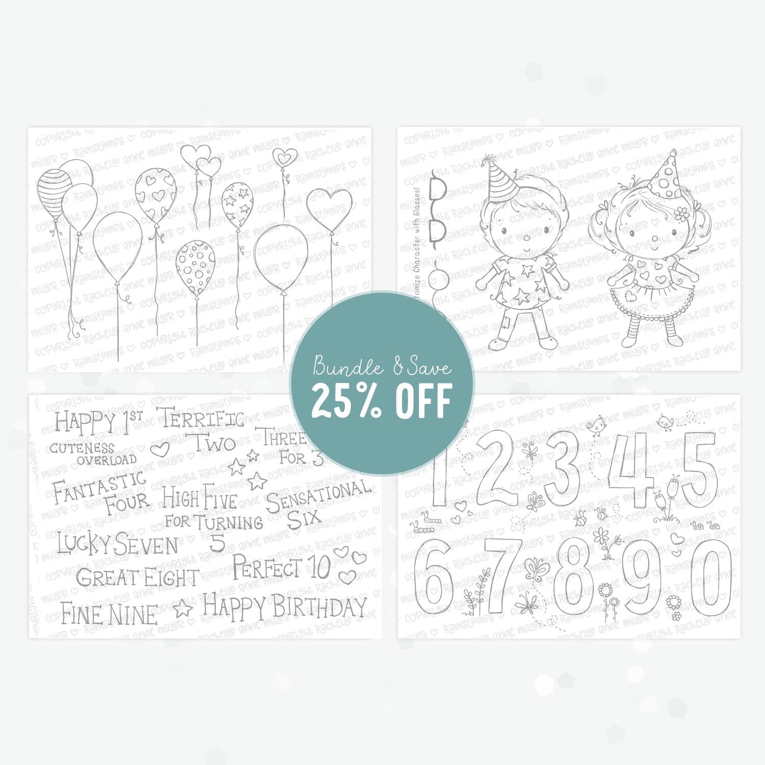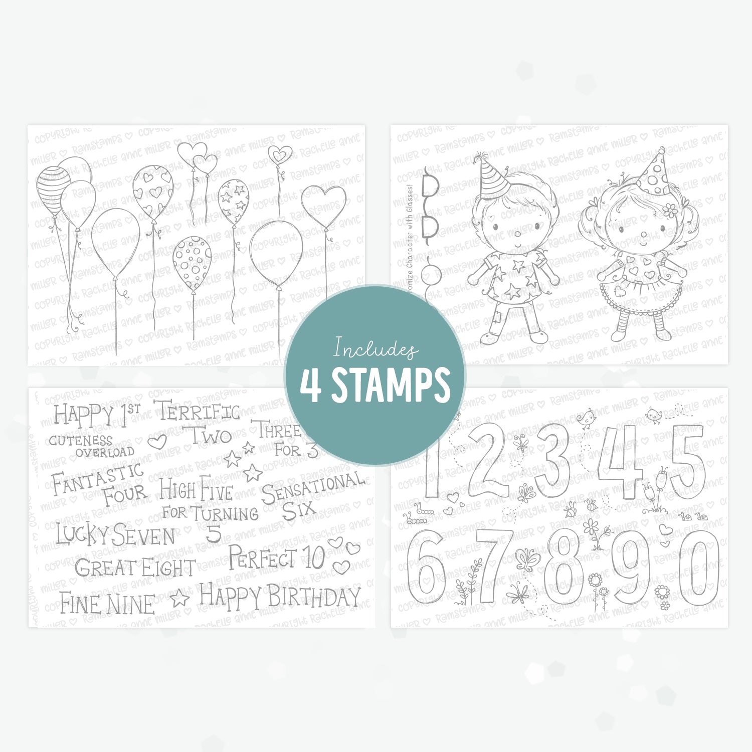 This listing is for 4 digital stamps (PNG Format) from Rachelle Anne Miller. Perfect for handmade cards, papercrafts, kid's colouring pages, and more, these whimsical hand-drawn digital stamps are the ideal cute and unique touch for your creative project! This set includes all the elements to create a unique and personalized birthday card for a little one (or not-so-little one!)