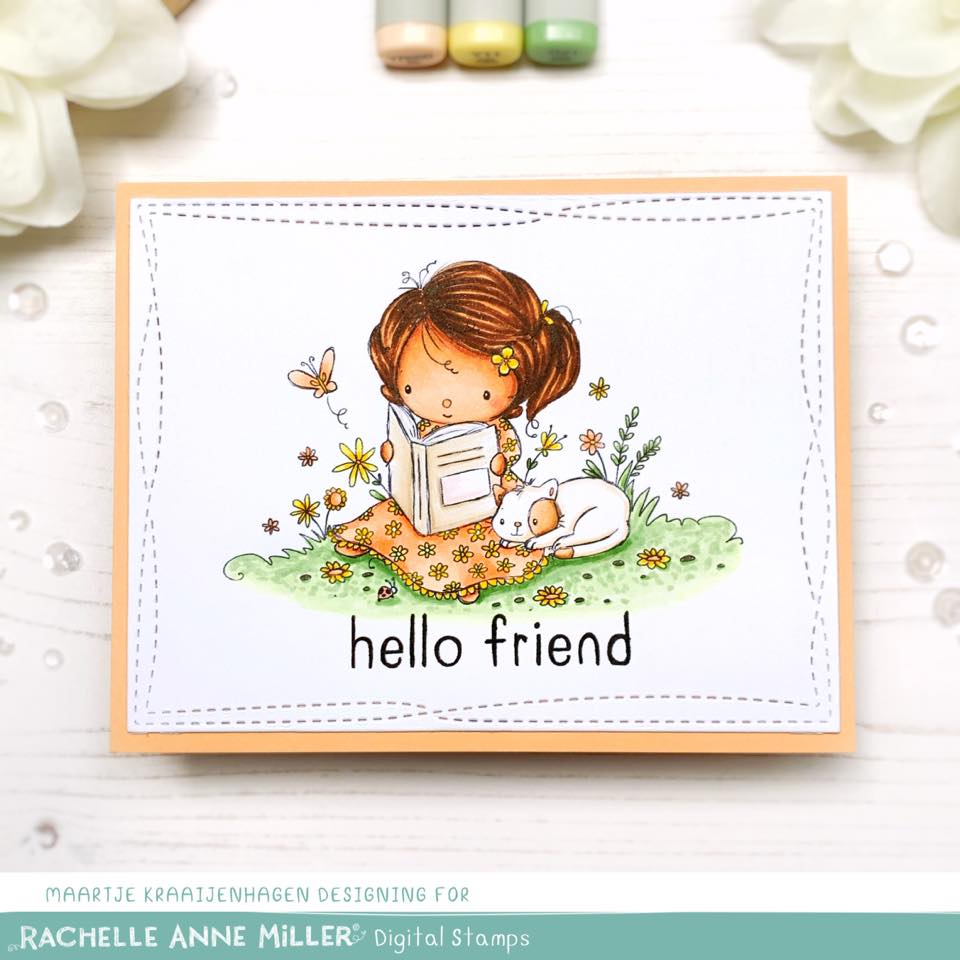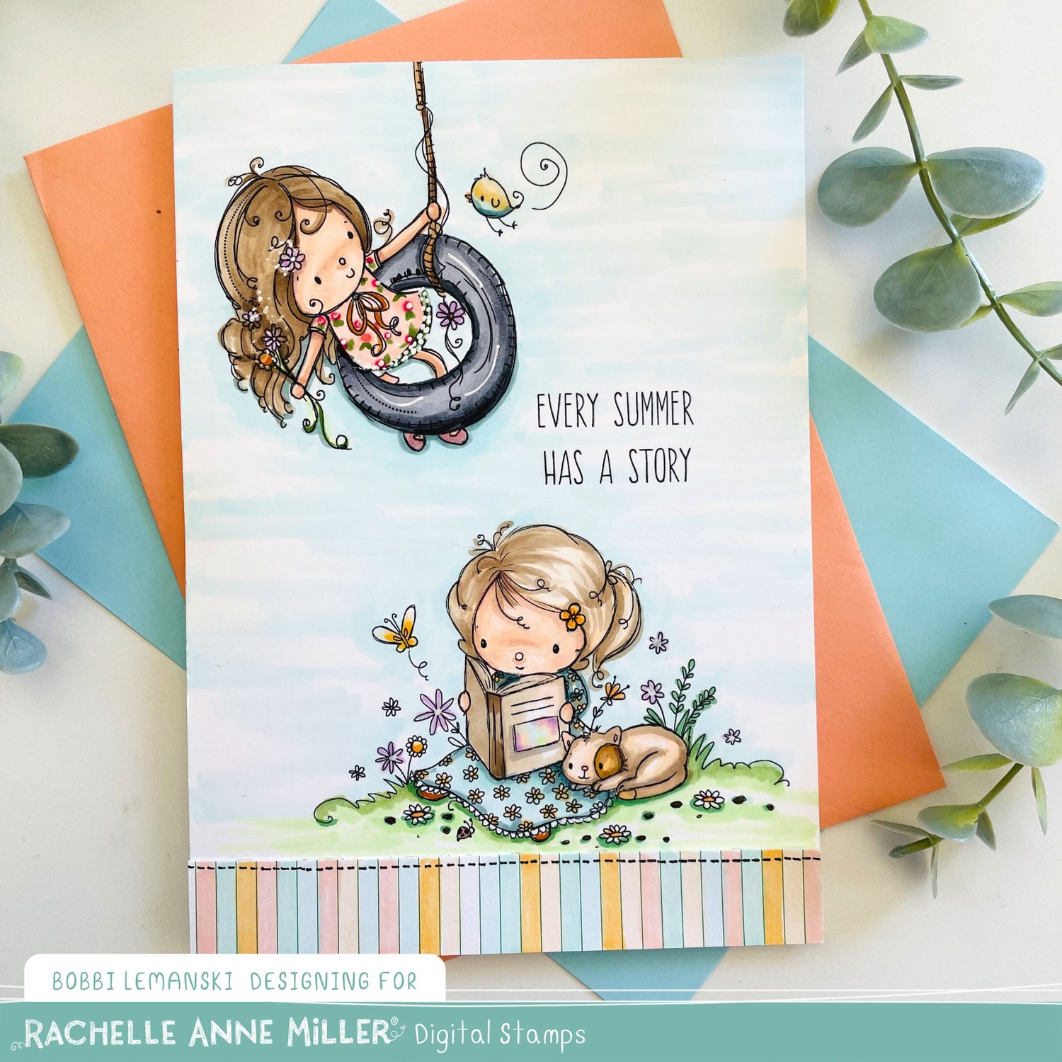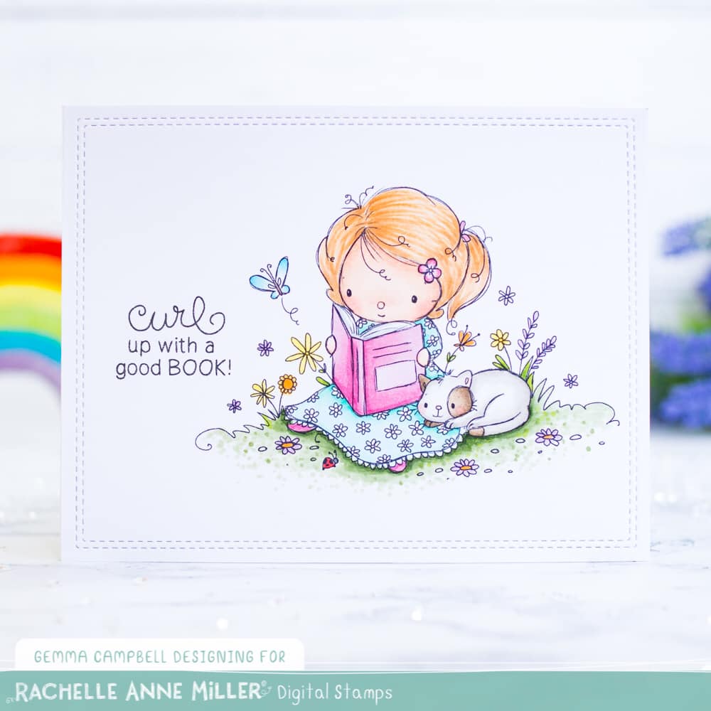 This listing is for a digital stamp (PNG Format) from Rachelle Anne Miller. Perfect for handmade cards, papercrafts, kid's colouring pages, and more, these whimsical hand-drawn digital stamps are the ideal cute and unique touch for your creative project. This stamp includes a little girl reading in a flower garden with her cat.