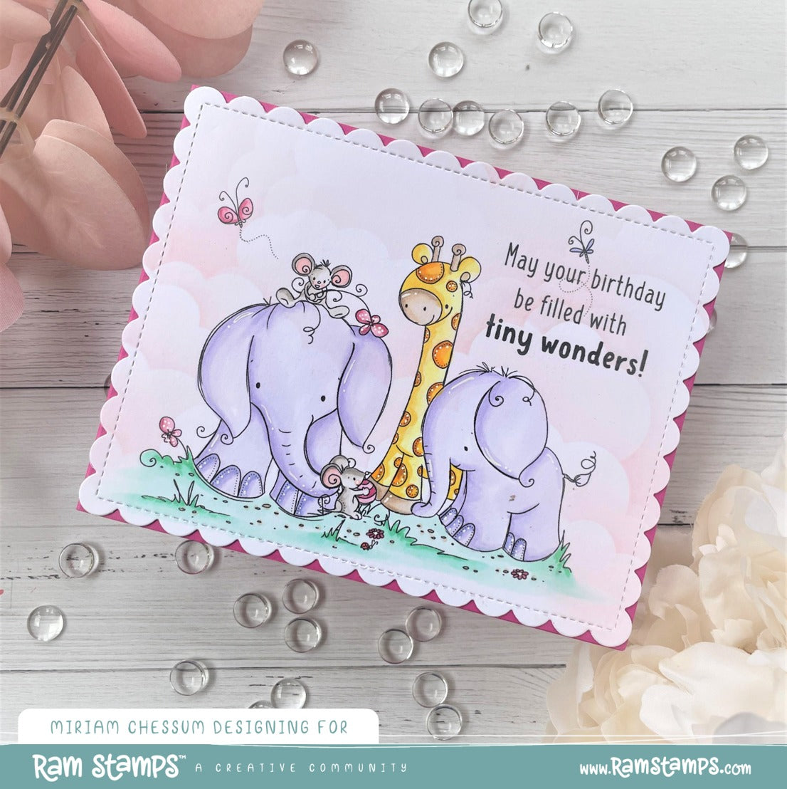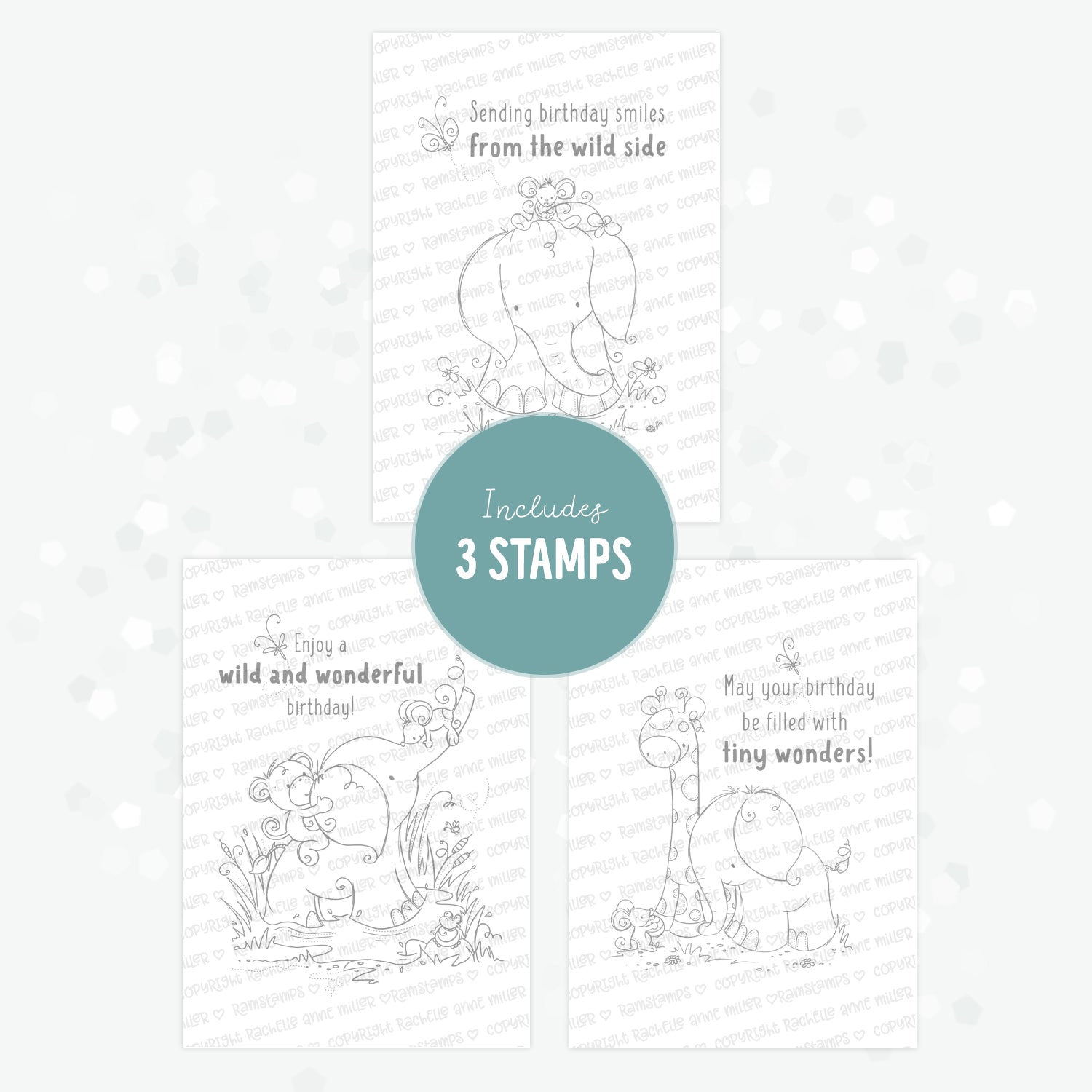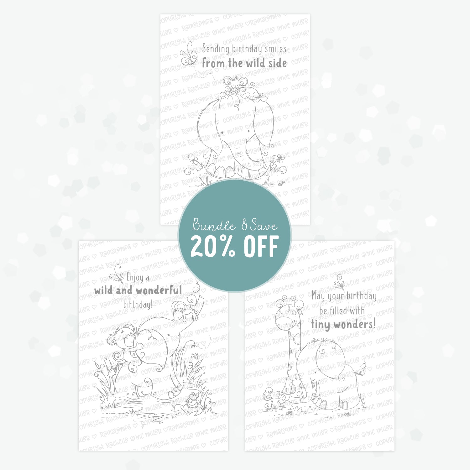 This listing is for three digital stamps (PNG Format) from Rachelle Anne Miller. Perfect for handmade cards, papercrafts, kid's colouring pages, and more, these whimsical hand-drawn digital stamps are the ideal cute and unique touch for your creative project.  This set includes a series of safari friends including a mouse, giraffe, and elephant. Use these stamps with or without the sentiment for any occasion!