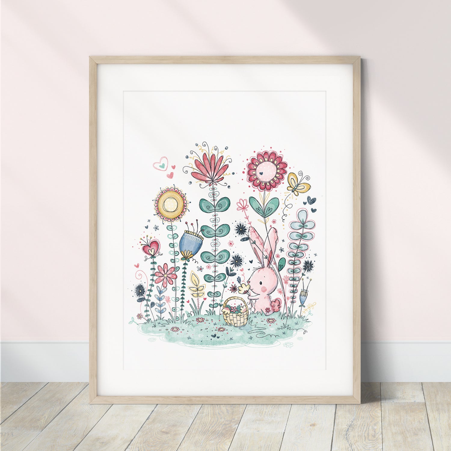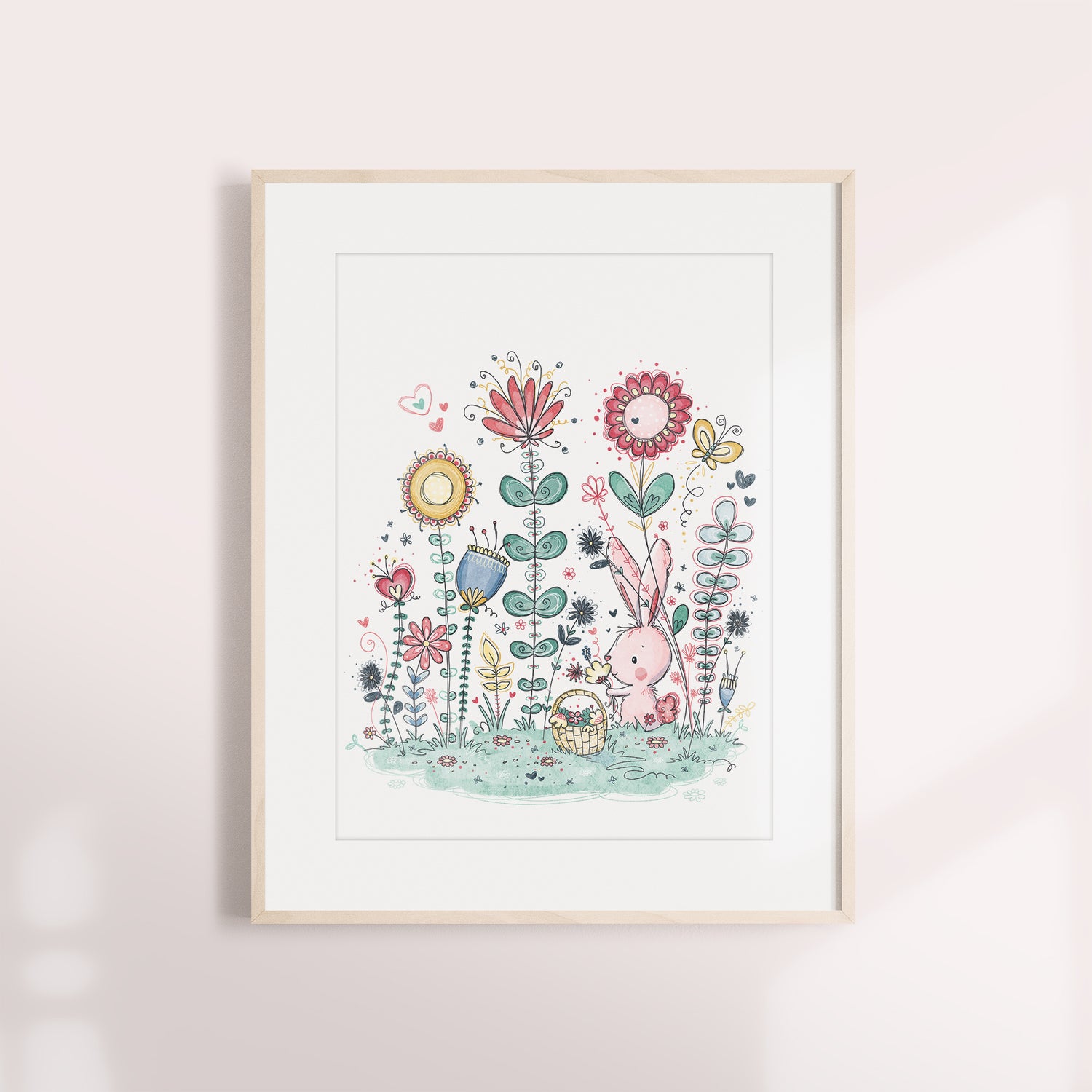 A bunny rabbit picks some wildflowers from her garden on a sunny afternoon! This wall art print is perfect for a little girl's bedroom or nursery.